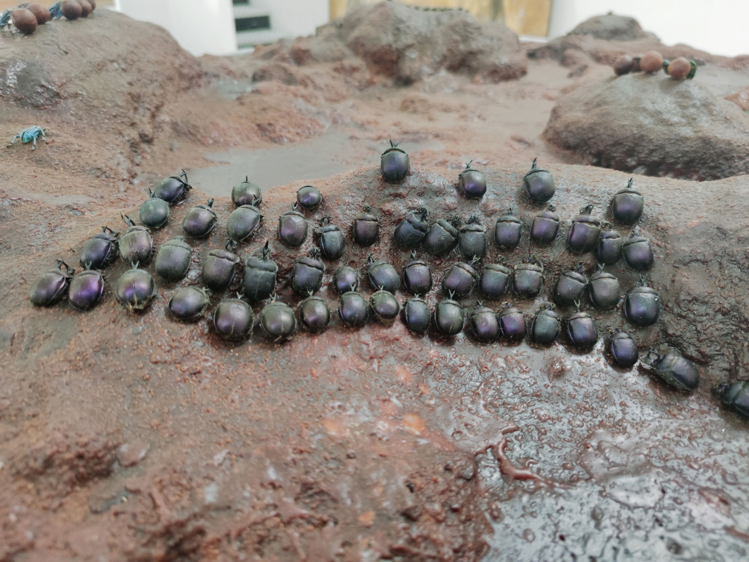 “Battlefield” è una potente opera che Jan Fabre (Anversa, 1958) dedica agli insetti e al loro essere parte dell’equilibrio universale di tutte le cose e, contemporaneamente, alla volontà di portare in scena una moderna metafora della guerra. Spesso l’artista sviluppa i concetti che vuole esprimere attraverso visioni legate agli scarabei, anche qui molto presenti, e che per Fabre sono paradigma assoluto dell’essere umano.