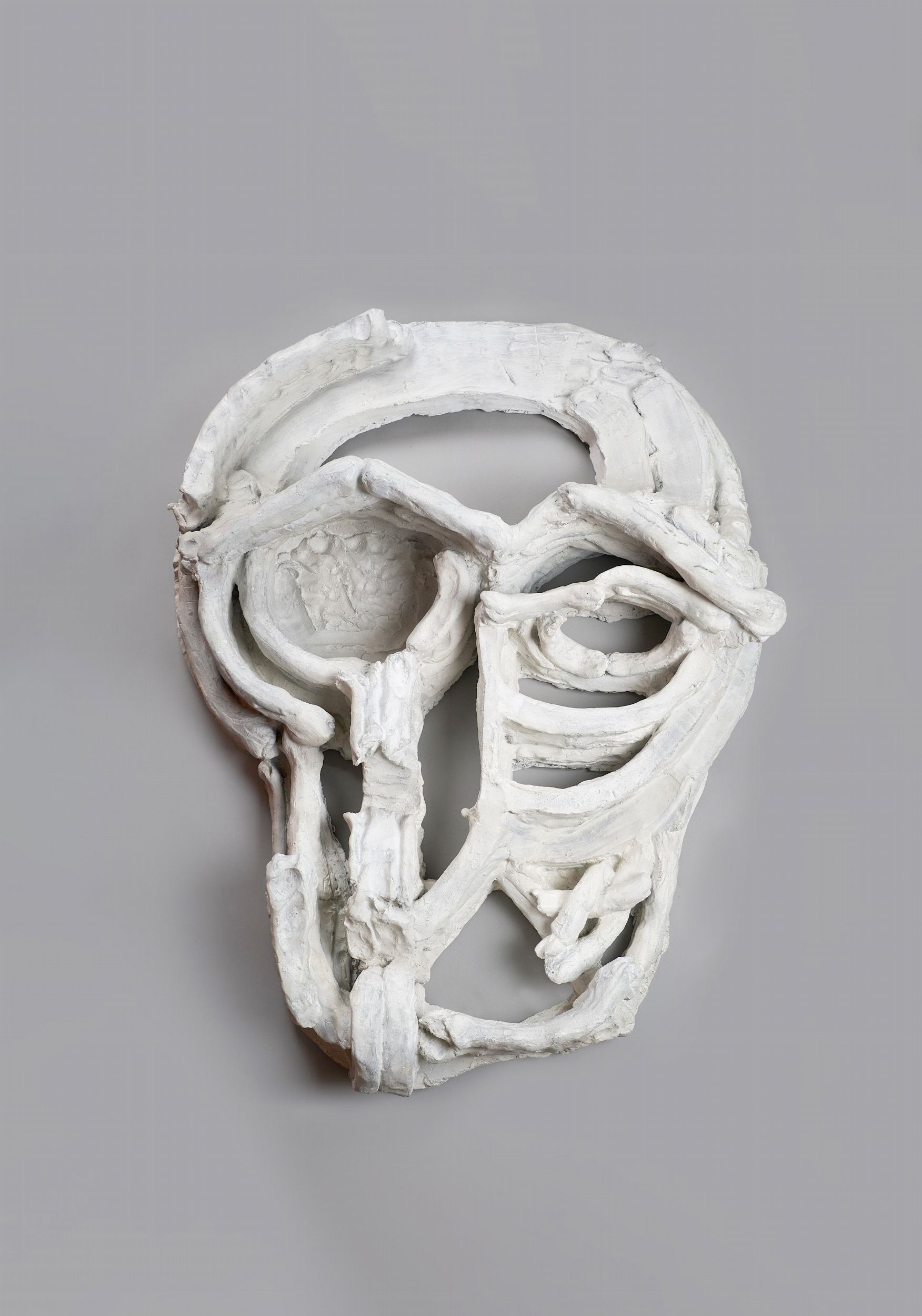 Le maschere di Houseago sono concentrati di materia grossolanamente plasmata; la scultura qui proposta proviene dalla sua serie di Roman Mask: imponenti opere dai bordi frastagliati, caratterizzate da un forte gioco di luce e ombra che rivela il profilo di un teschio deformato, sostenuto da uno scheletro in metallo e composto da gesso, che l’artista modella matericamente utilizzando mani e piedi.