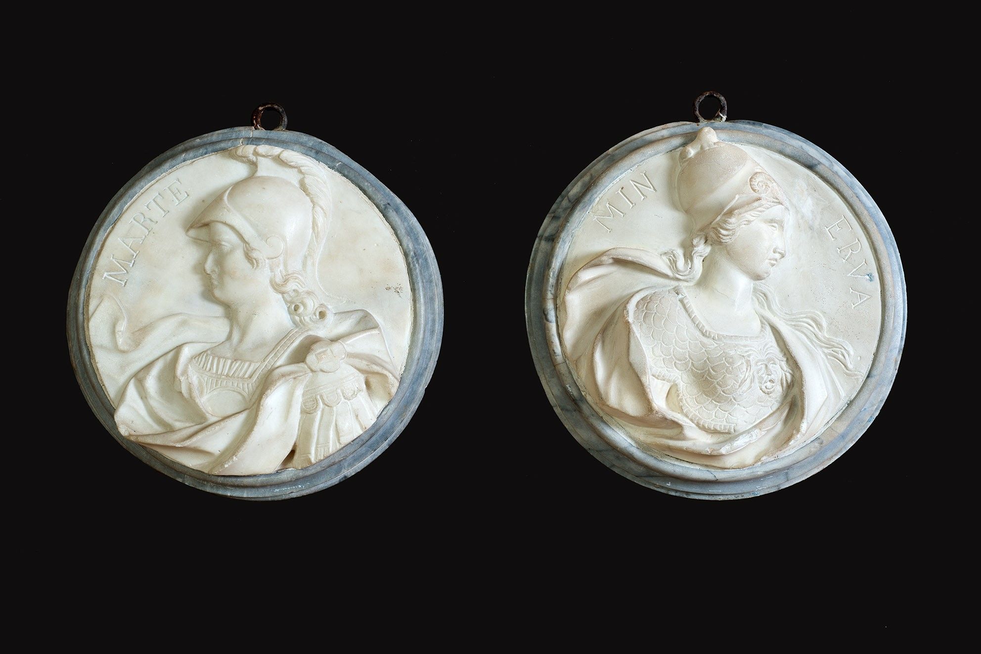 coppia di bassorilievi in marmo bianco, diam. cm 24