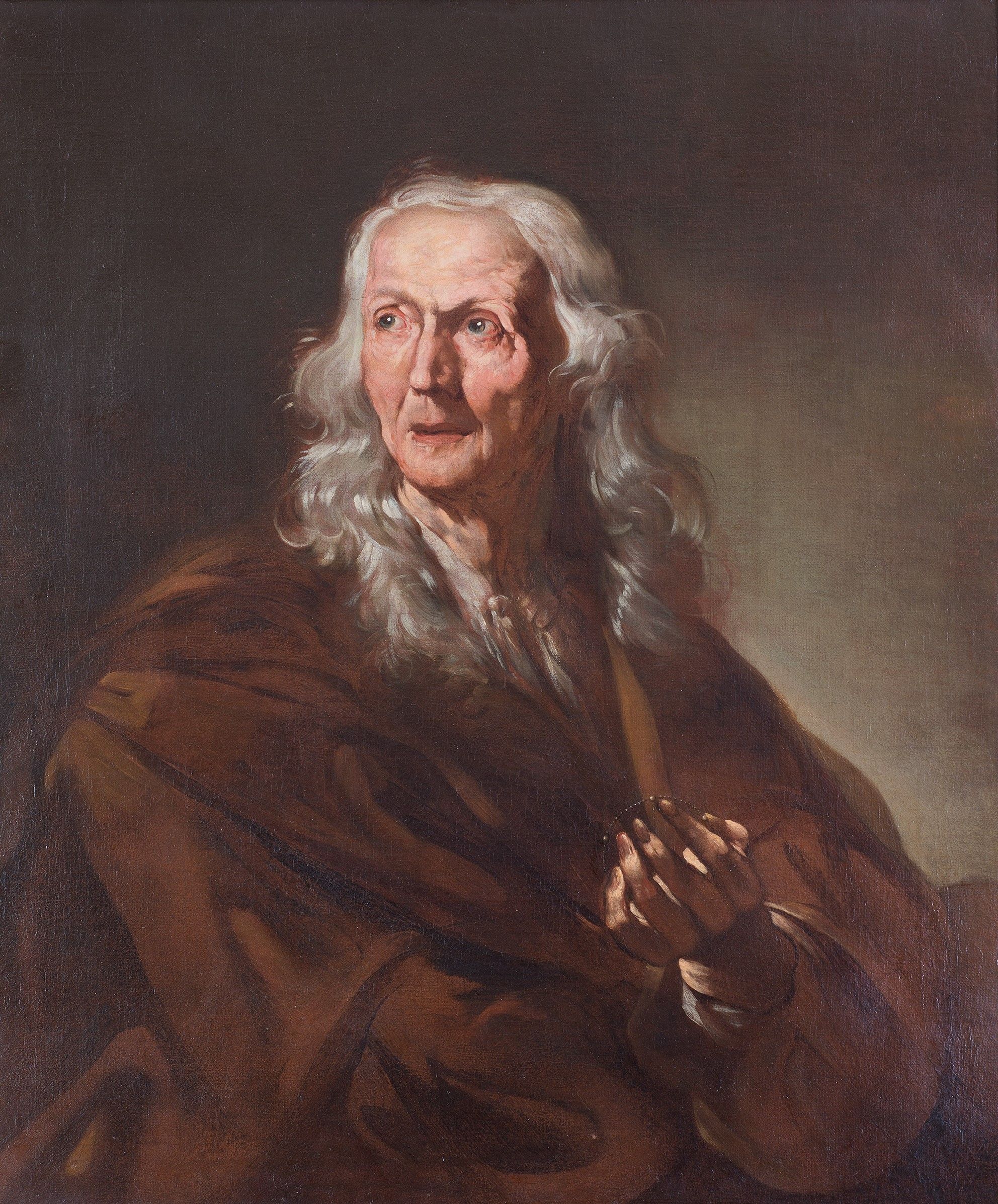 Il dipinto presenta sul retro il sigillo di Clorinda Carafa della Stadera (1799-1864) ultima Duchessa di Maddaloni, il che permette di ipotizzare che il dipinto possa essere individuato in quello citato nell'inventario del 1713 di Giovanni Battista Rospigliosi al n. 644: un quadro in tela di mezza testa rappresenta una vecchia con corona in mano, opera di Guido