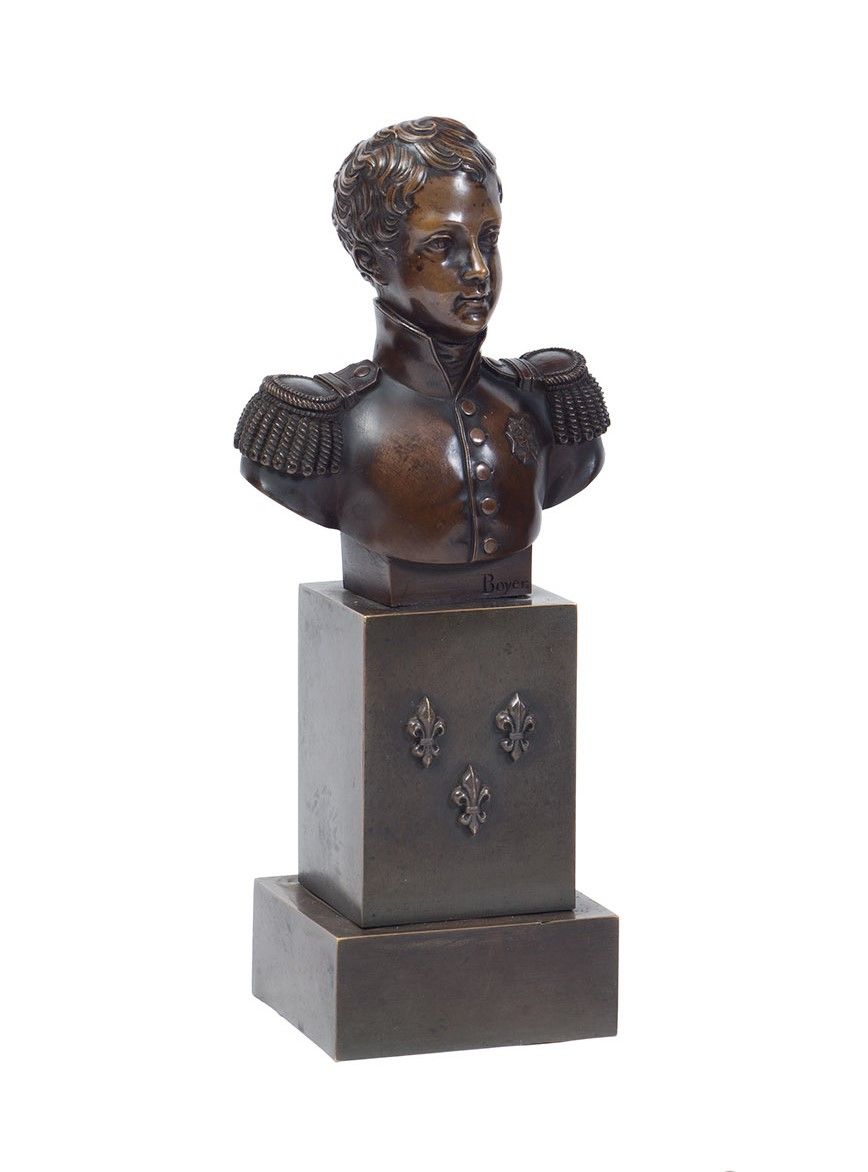 Il bustino di raffinata esecuzione poggia su un plinto in bronzo decorato ai tre gigli di Francia.