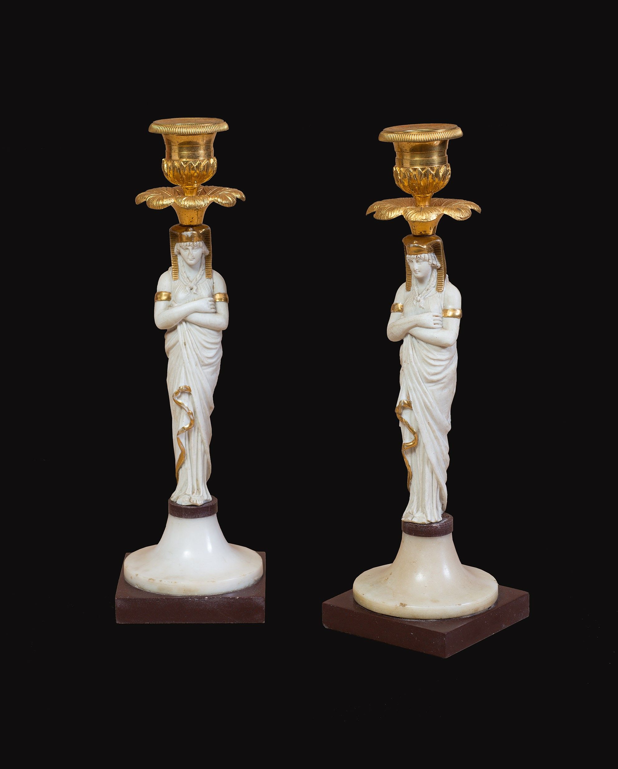 Coppia di candelieri in biscuit, bronzo dorato e marmi