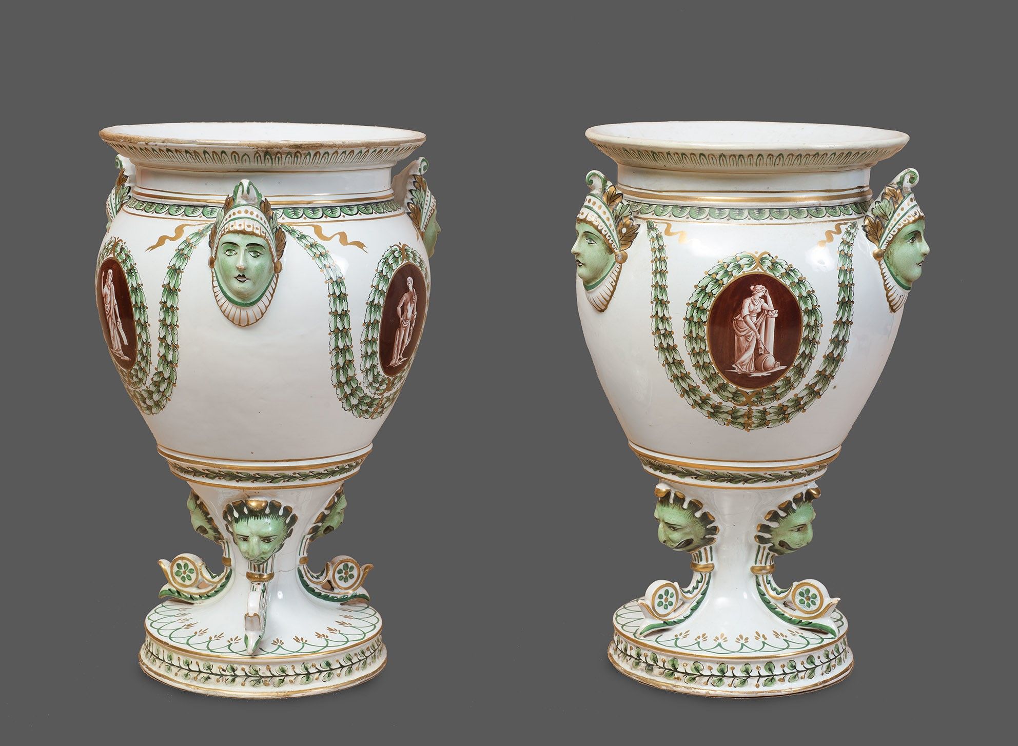 rlo svasato.Decorazioni a festoni color verde ed oro a circoscrivere tre medaglioni con riserve a cammeo istoriati con figure classiche dal repertorio statuario archeologico su fondo color bruno.