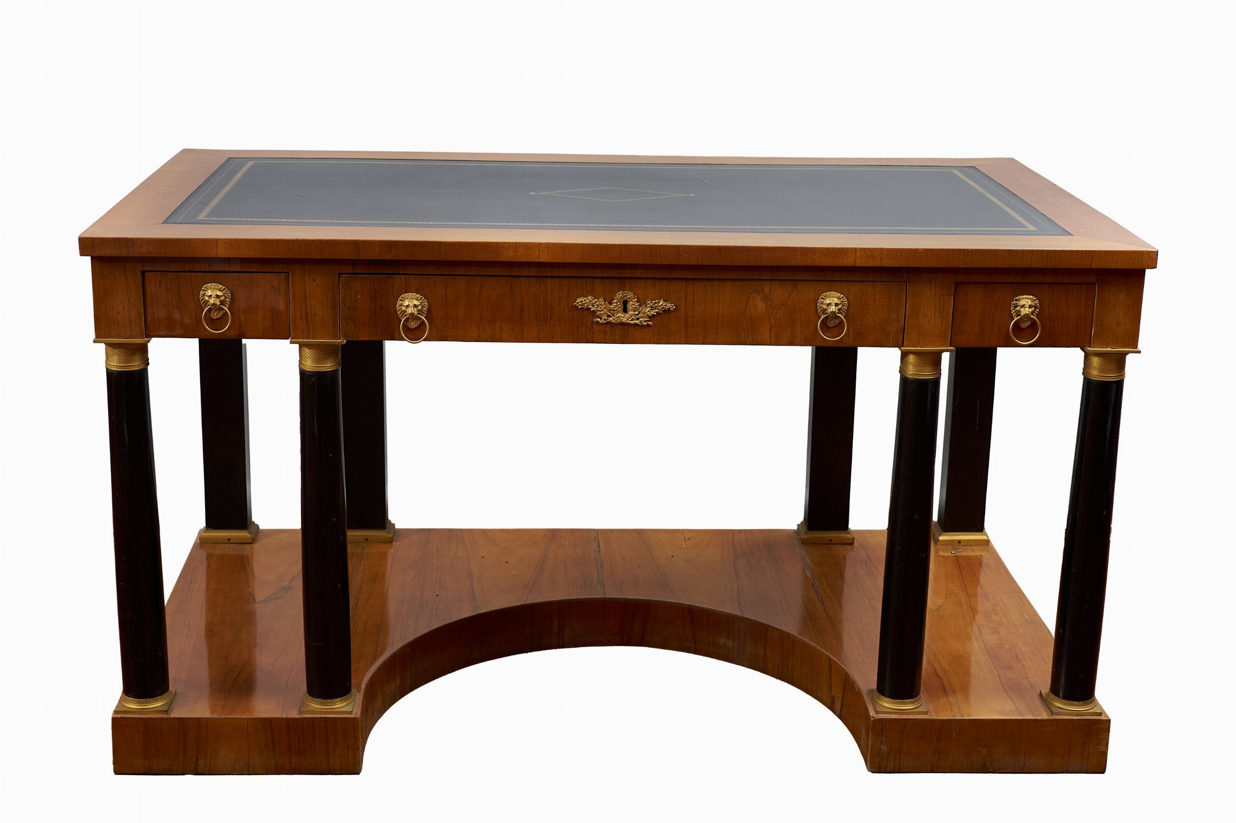 in legno di ciliegio, doppie colonne ebanizzate su capitelli dorati, base rivestita in pelle verde con pianetti estraibili laterali