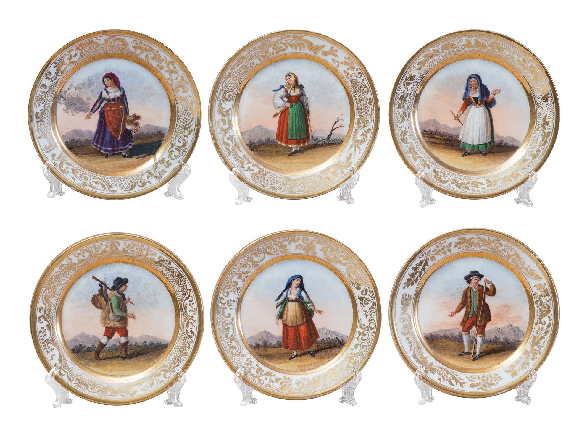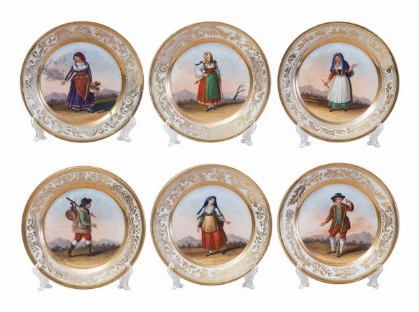 tesa decorata in oro a motivi naturalistici in sequenza, cavetto decorato con figure in costume