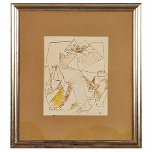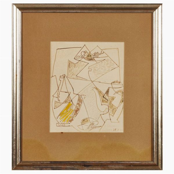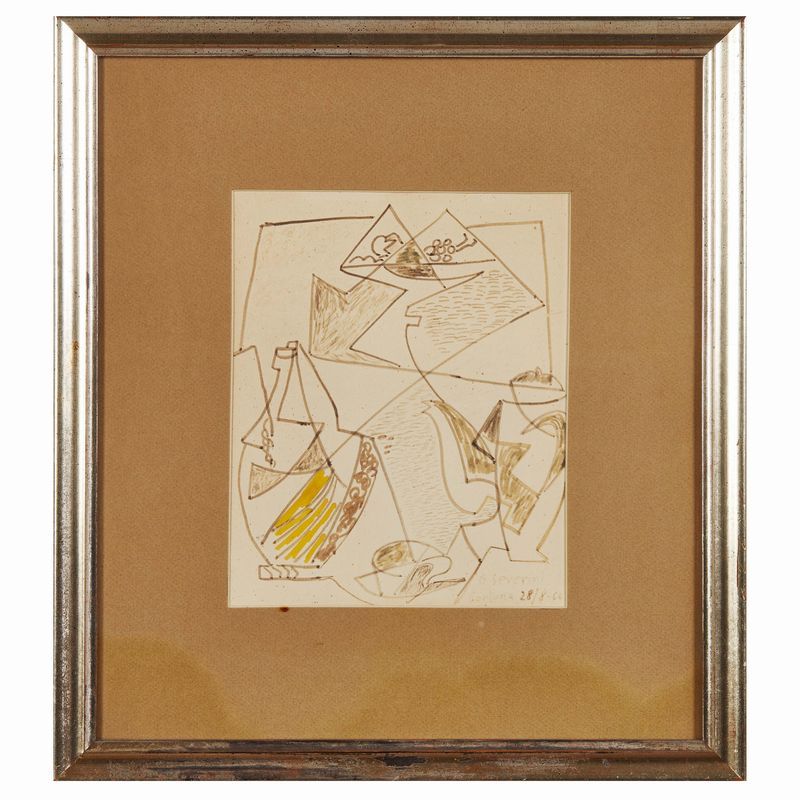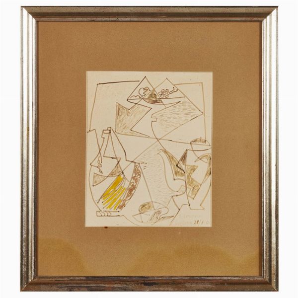 GINO SEVERINI (Cortona 1883 - Paris 1966) Composizione con fiasco 1964 tecnica mista su carta cm 25x20 firmato e datato in basso a destra “G. Severini / Cortona 28/8-64”