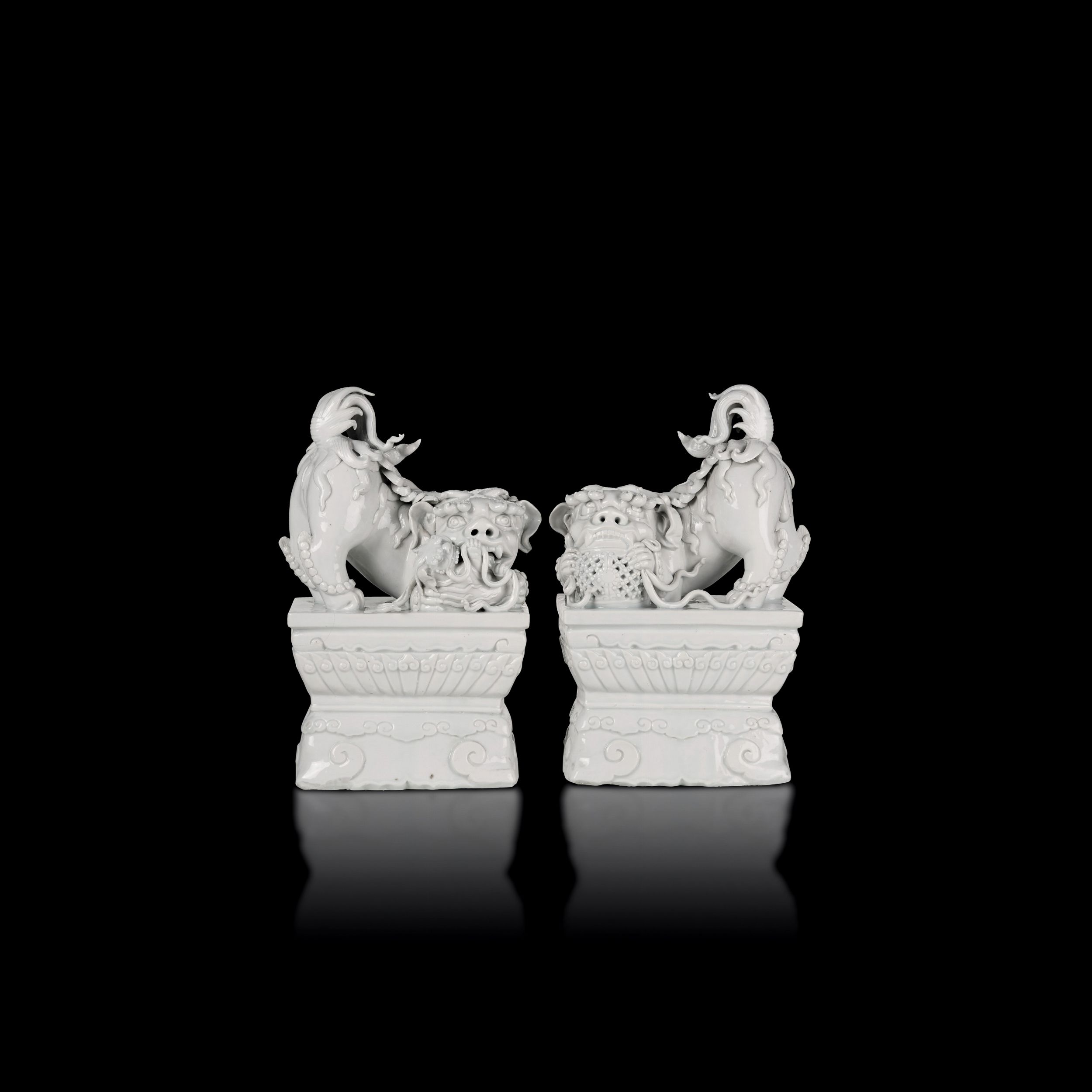 Coppia di cani di Pho in porcellana blanc de Chine, Cina, Dehua, Dinastia Qing, [..]