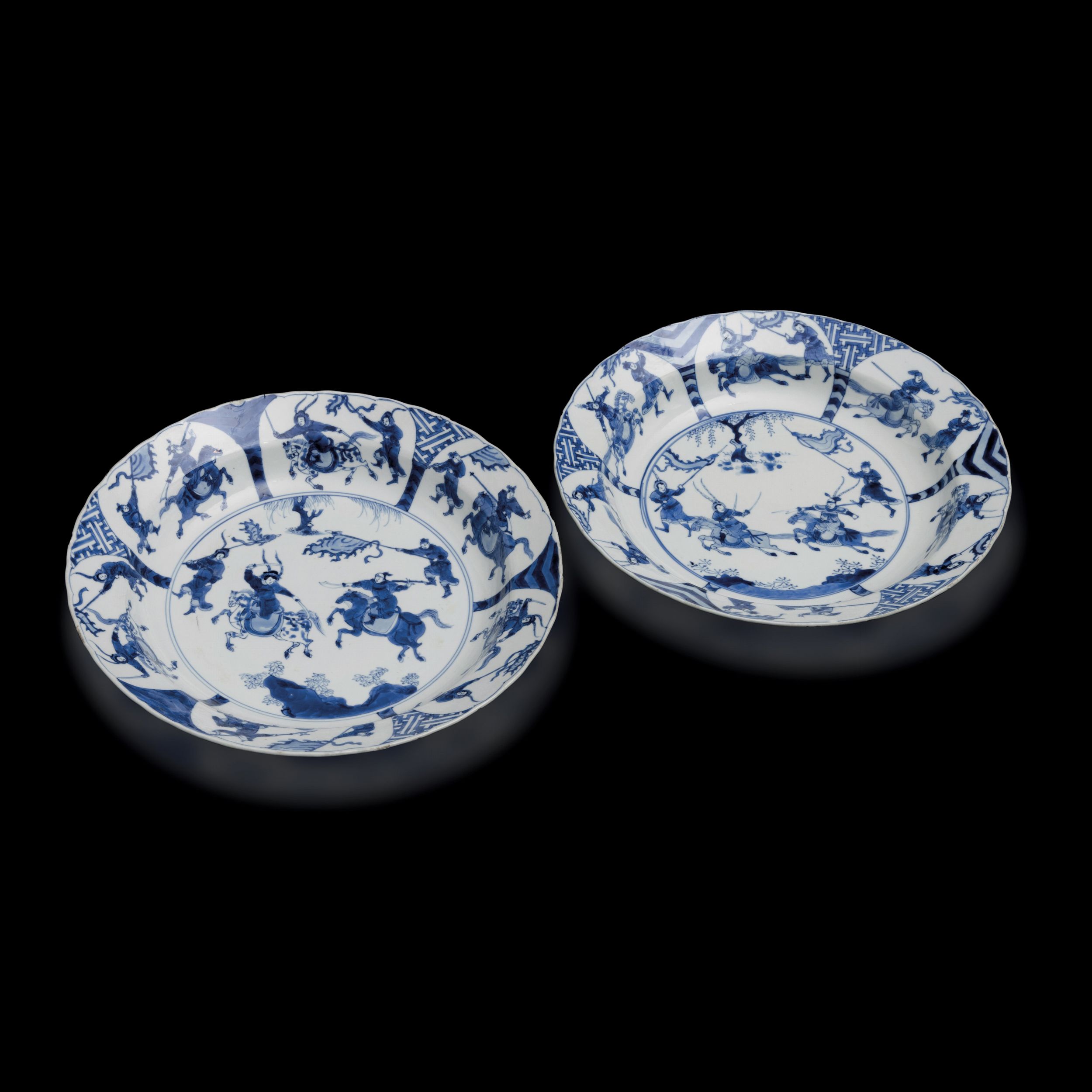 Coppia di piatti fondi in porcellana bianca e blu a decoro di battaglia, Cina, Dinastia [..]