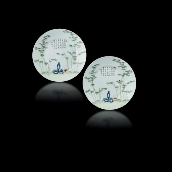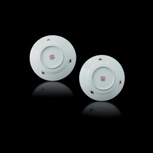 Coppia di piattini in porcellana a decoro vegetale con iscrizioni, Cina, Repubblica, [..]