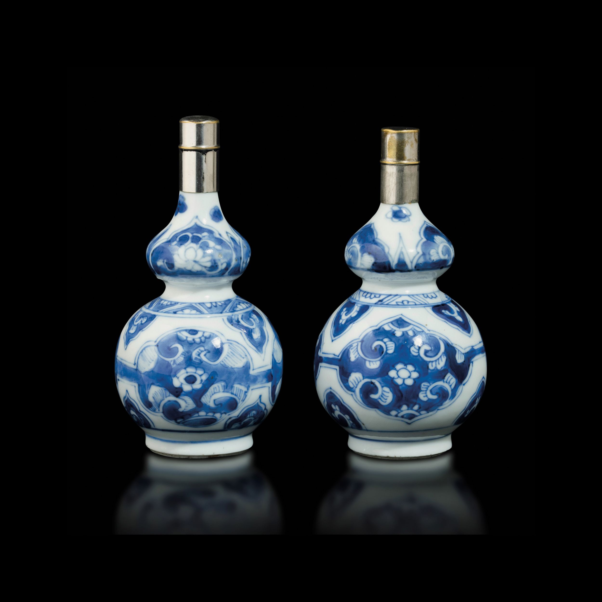 Coppia di vasetti a doppia zucca in porcellana bianca e blu, Cina, epoca Qing, periodo [..]