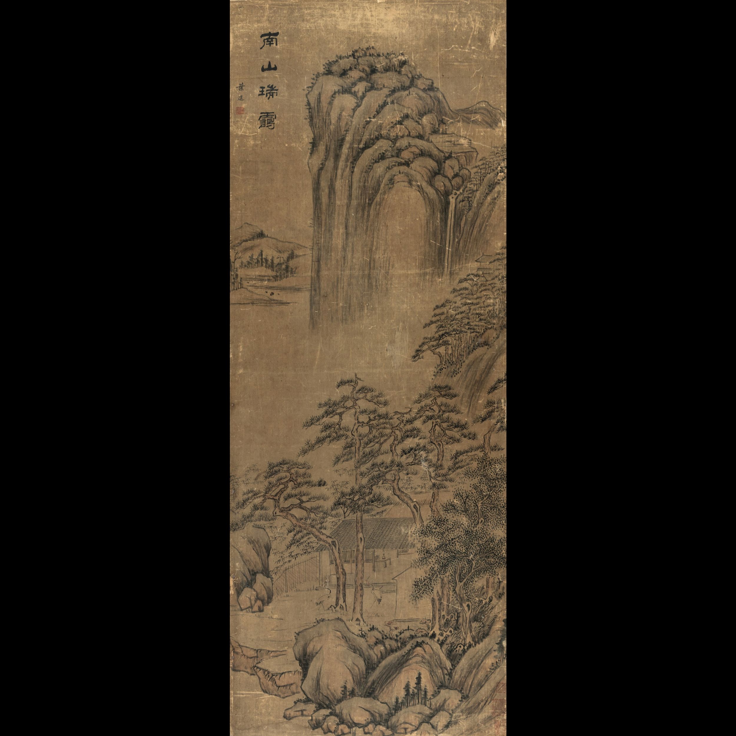 Dipinto su carta applicato su pannello a decoro di paesaggio e iscrizioni, Cina, [..]