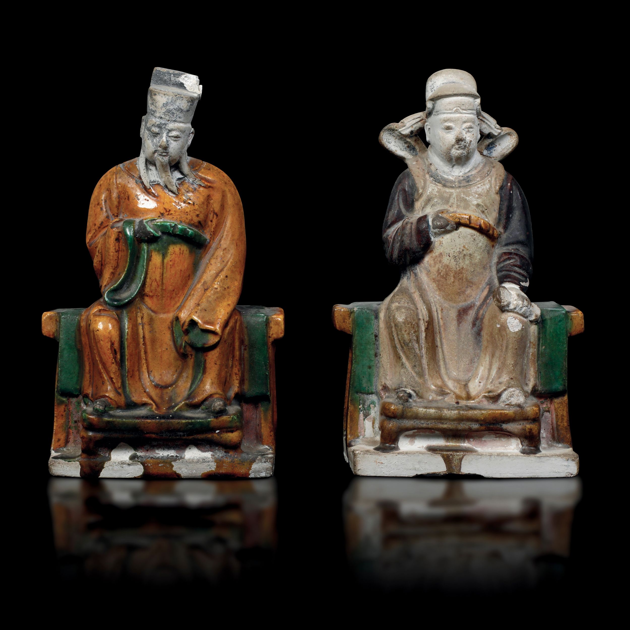 Due figure di dignitari in stoneware sancai nei toni del giallo, verde e burro, [..]