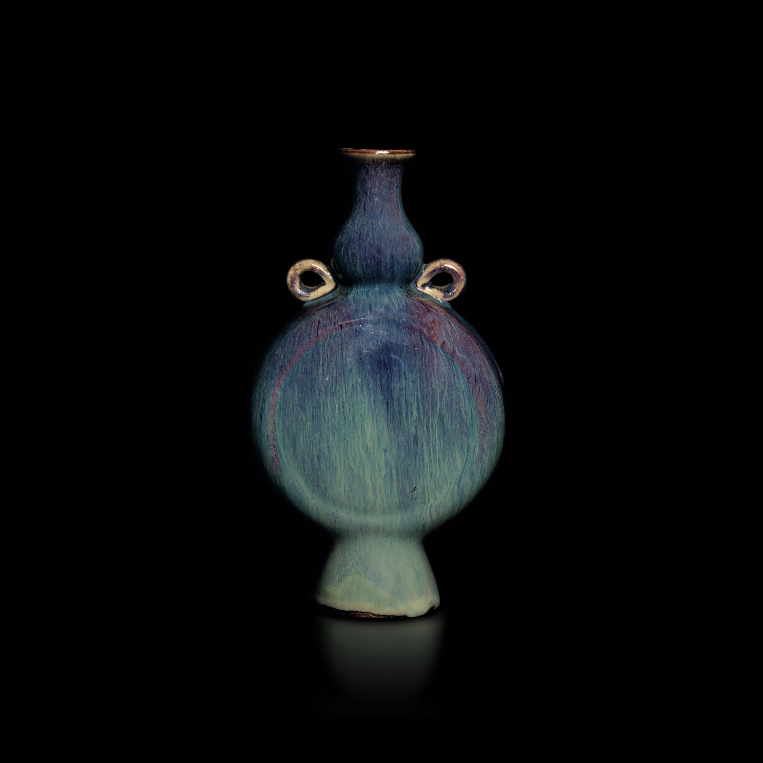 Fiasca in porcellana flambè sui toni del viola e dell'azzurro con piccole anse, [..]