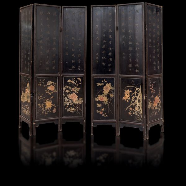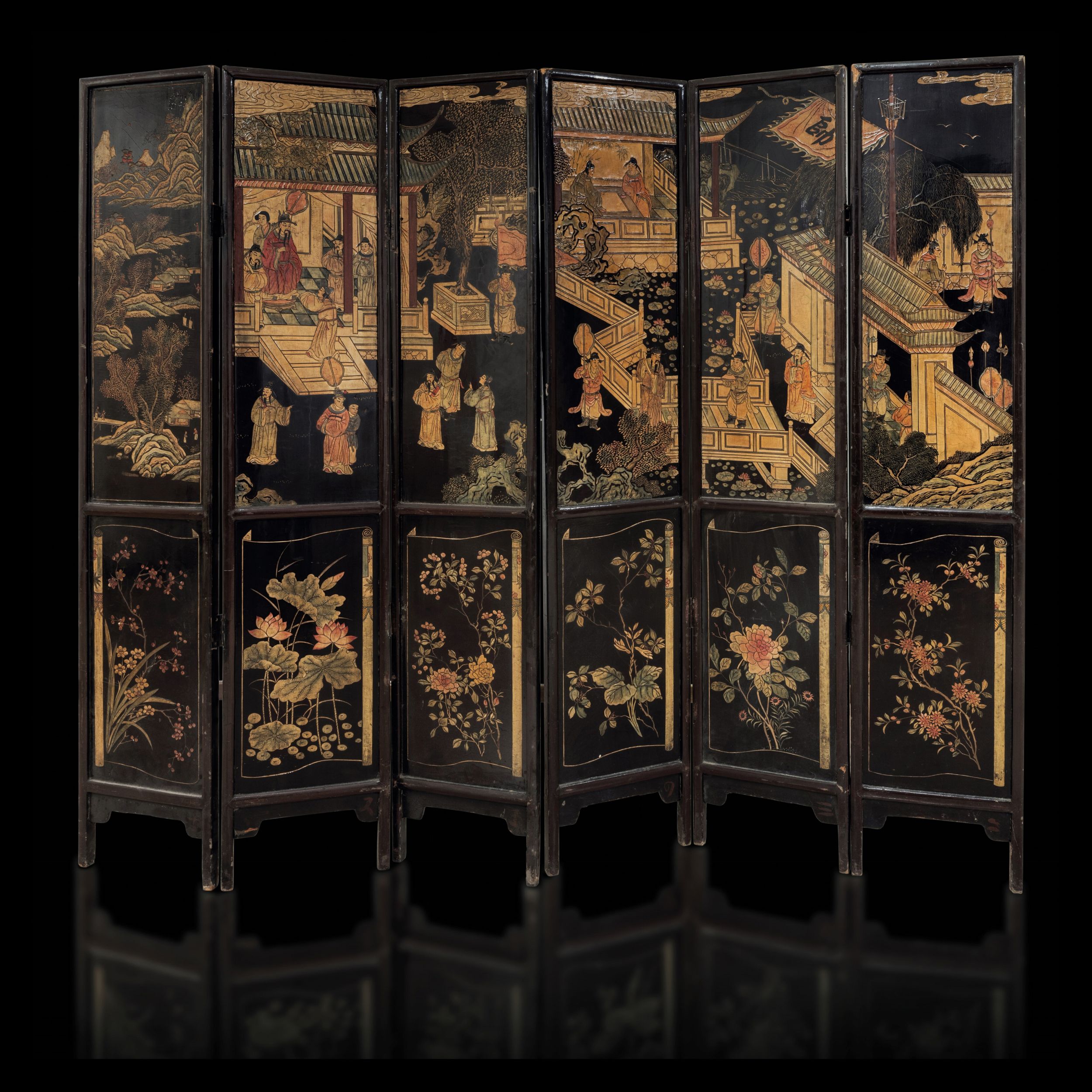 Grande paravento a sei ante in legno laccato coromandel con scene di vita comune [..]