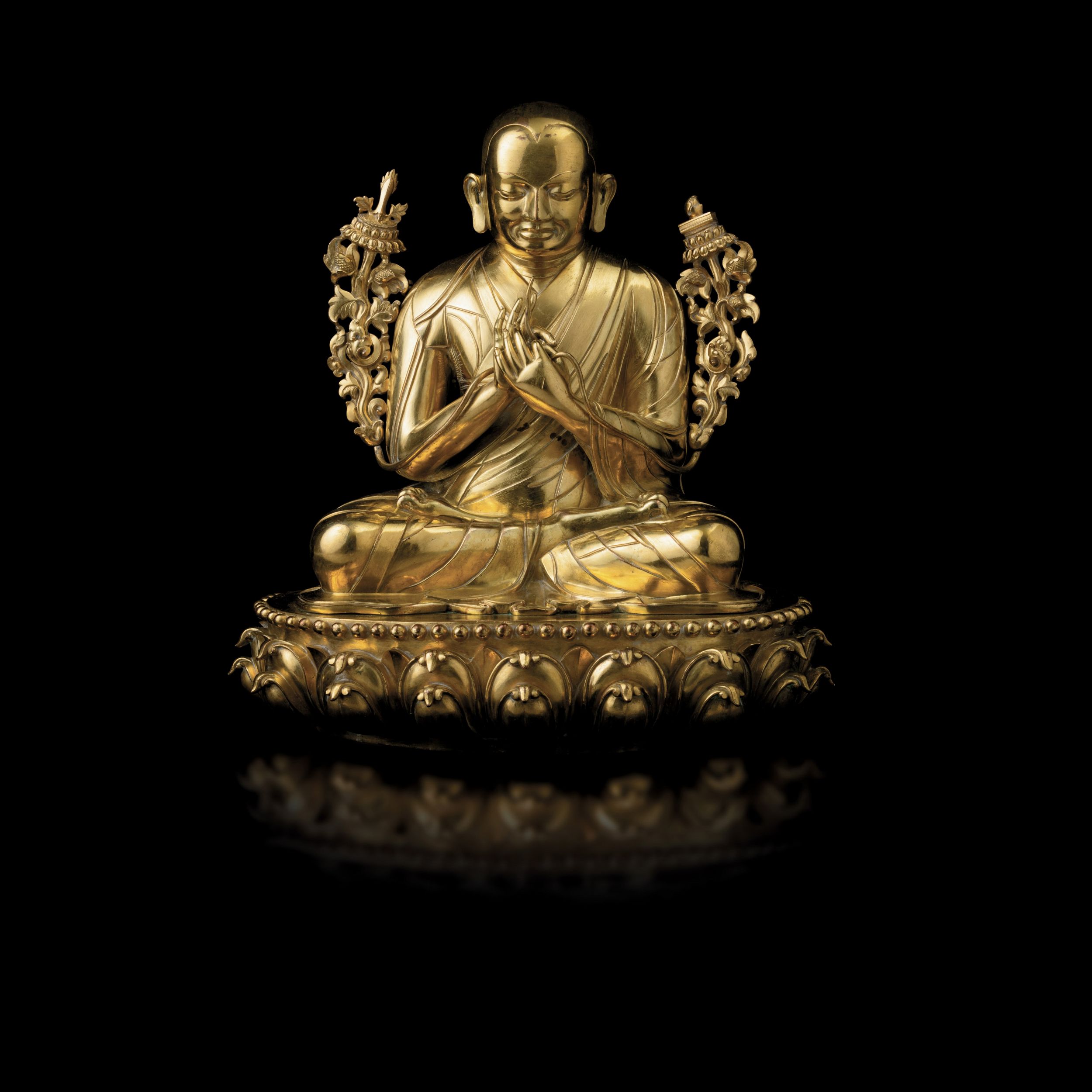Importante figura di Lama Tzongkhapa seduto su fiore di loto in bronzo dorato, Tibet, [..]