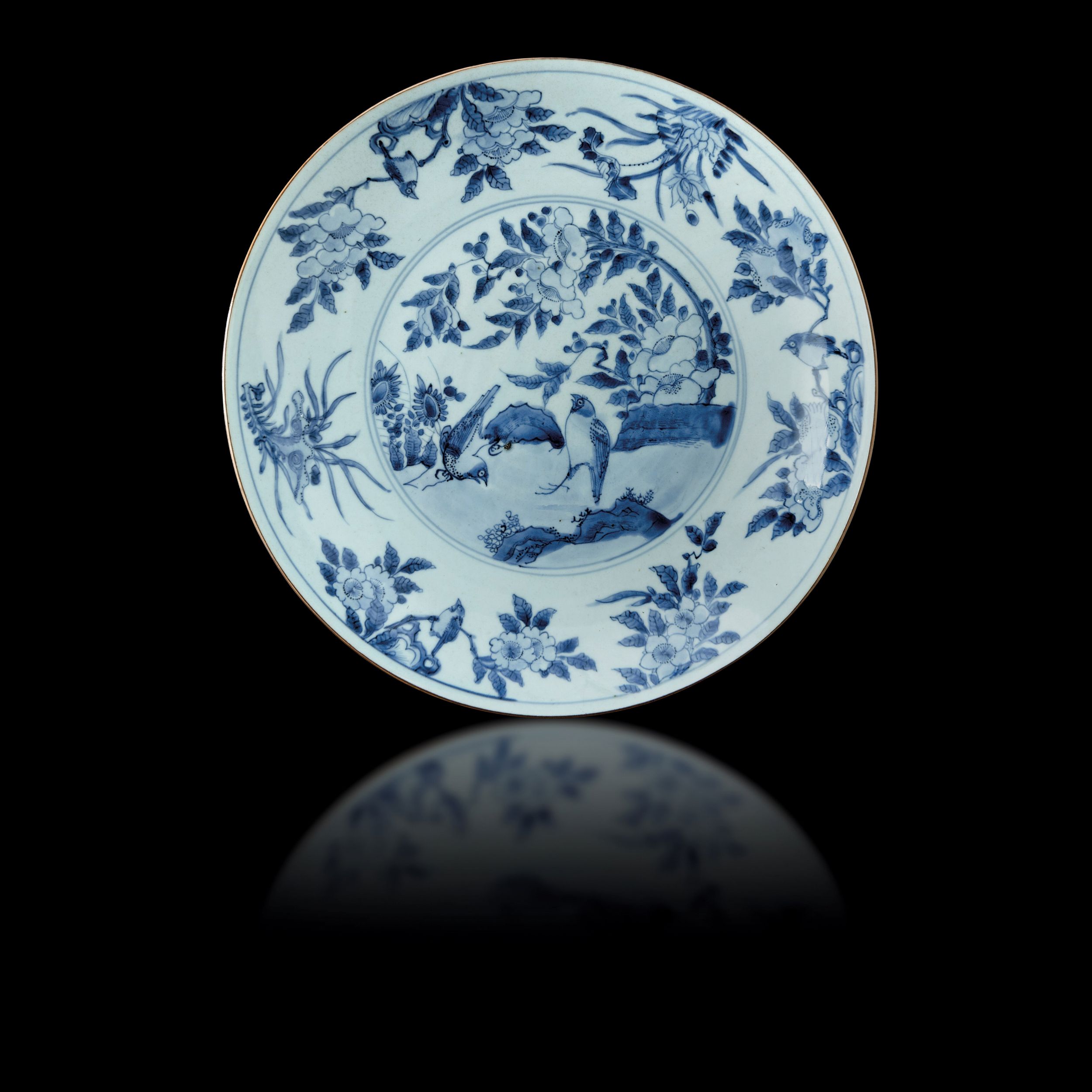 Piatto in porcellana bianca e blu a decoro di uccellini in paesaggio floreale, Cina, [..]