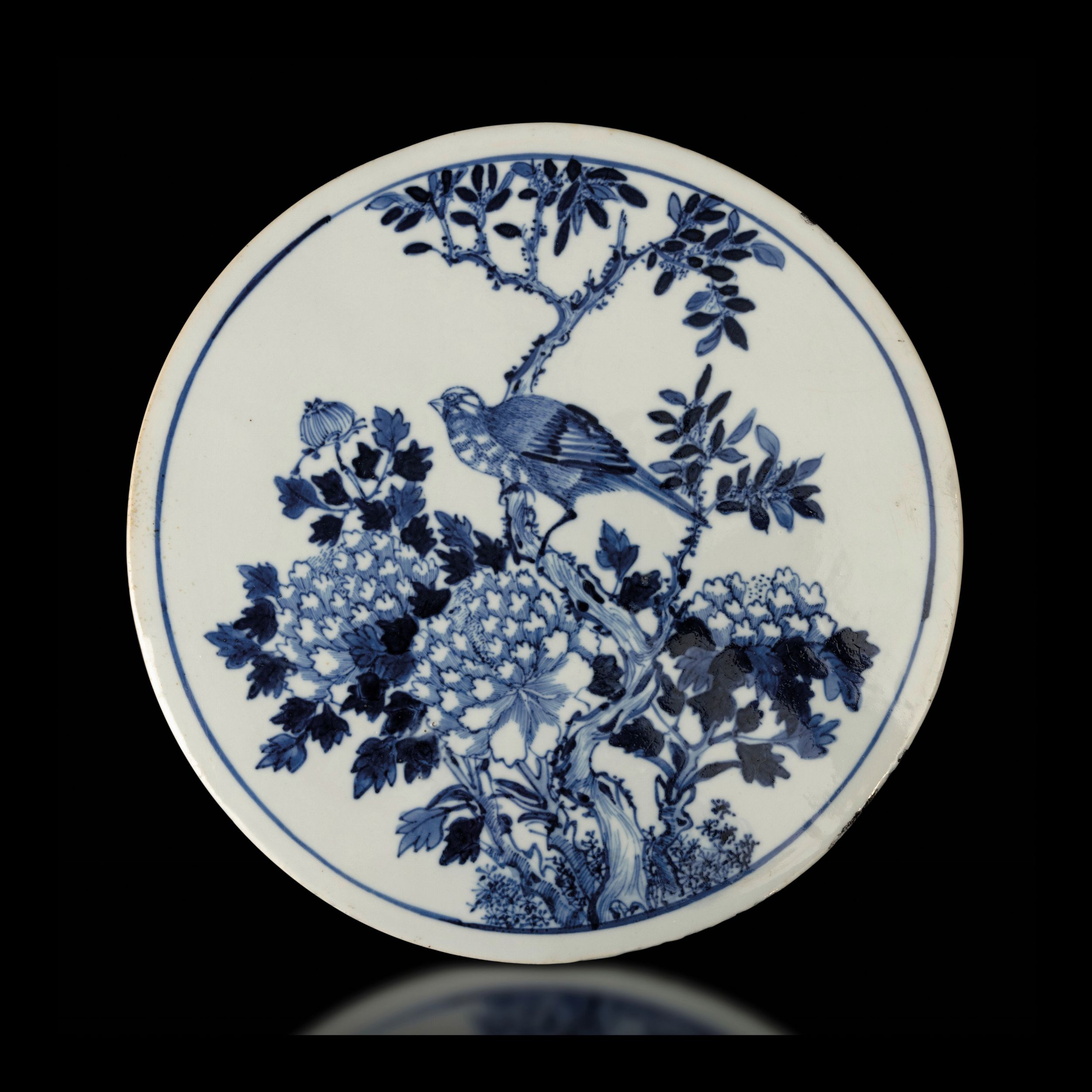 Piatto in porcellana bianca e blu a decoro naturalistico, Cina, Dinastia Qing, epoca [..]