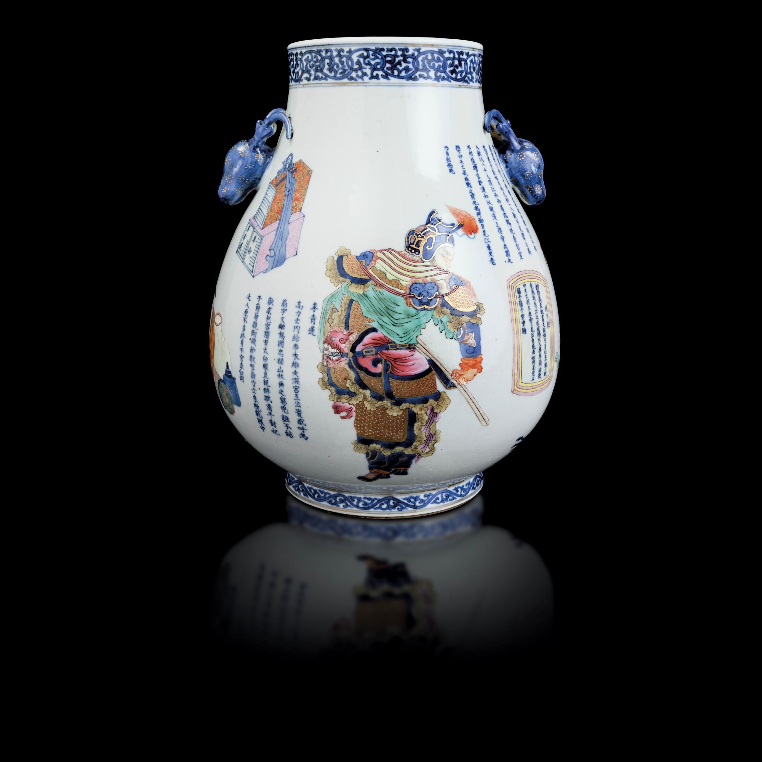 Raro vaso in porcellana a decoro di personaggi con iscrizioni e prese con teste [..]