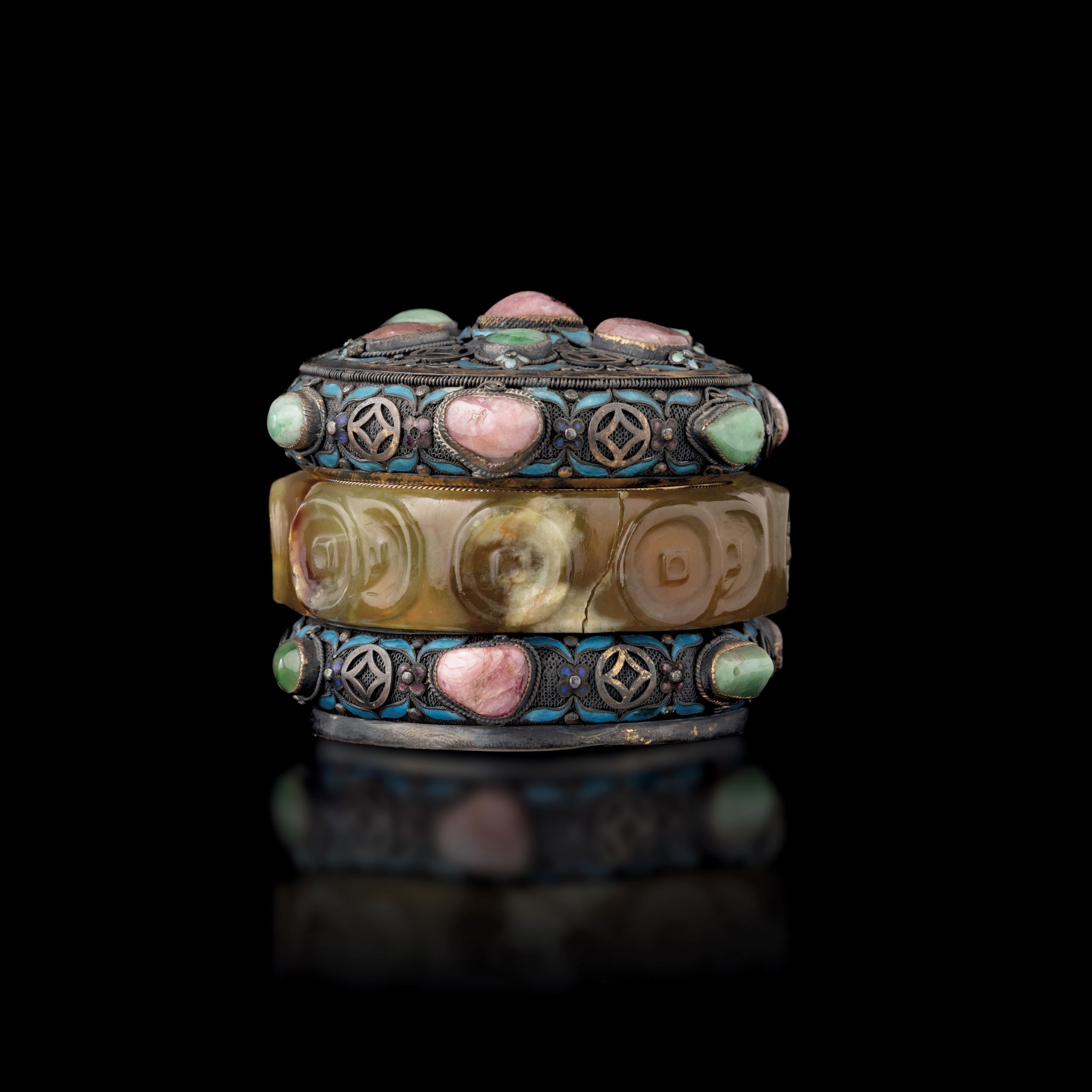 Scatola in argento, smalti, pietre dure, giade con bracciale in agata, Cina, Dinastia [..]