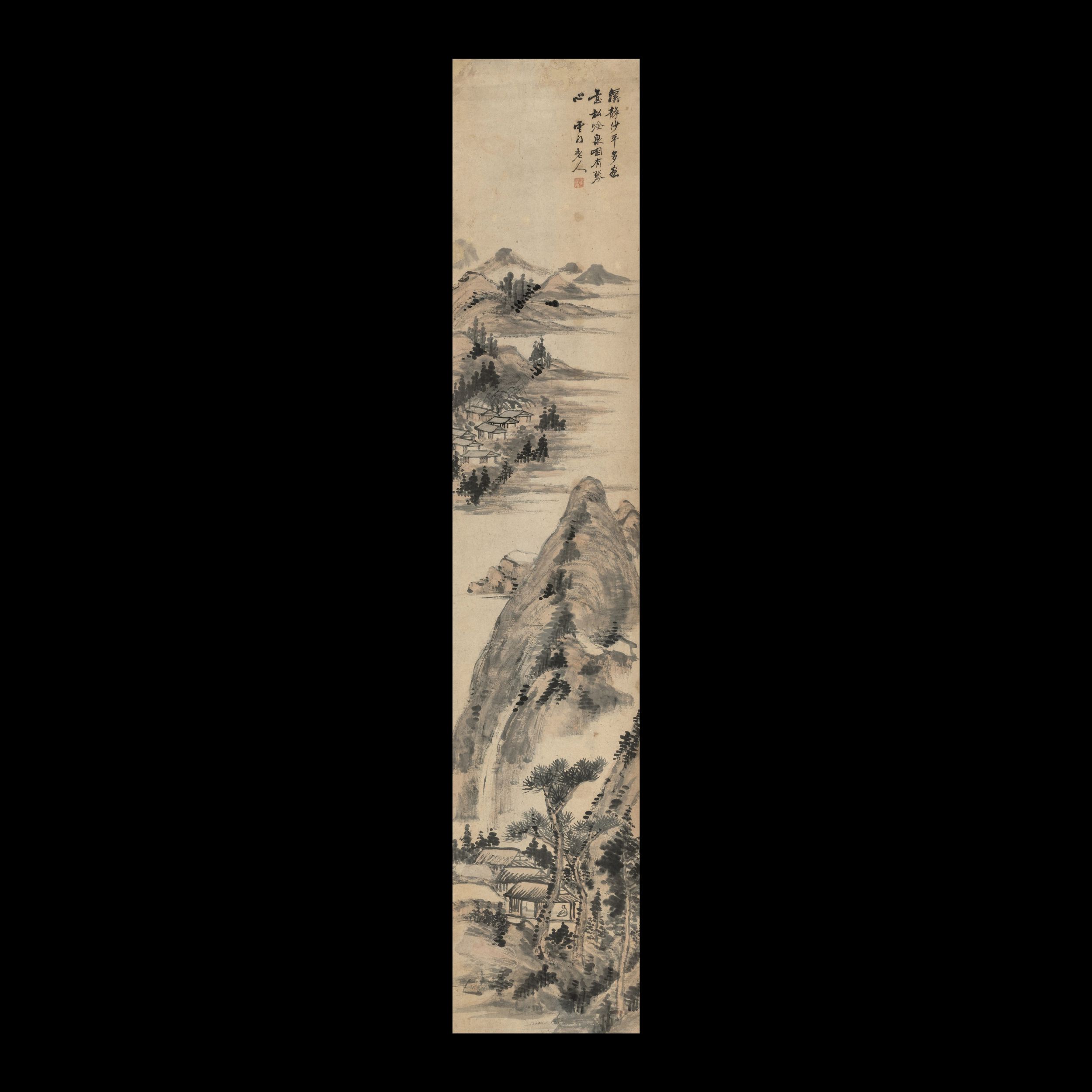 Scroll su carta a decoro di paesaggio e iscrizioni, Cina, XX secolo