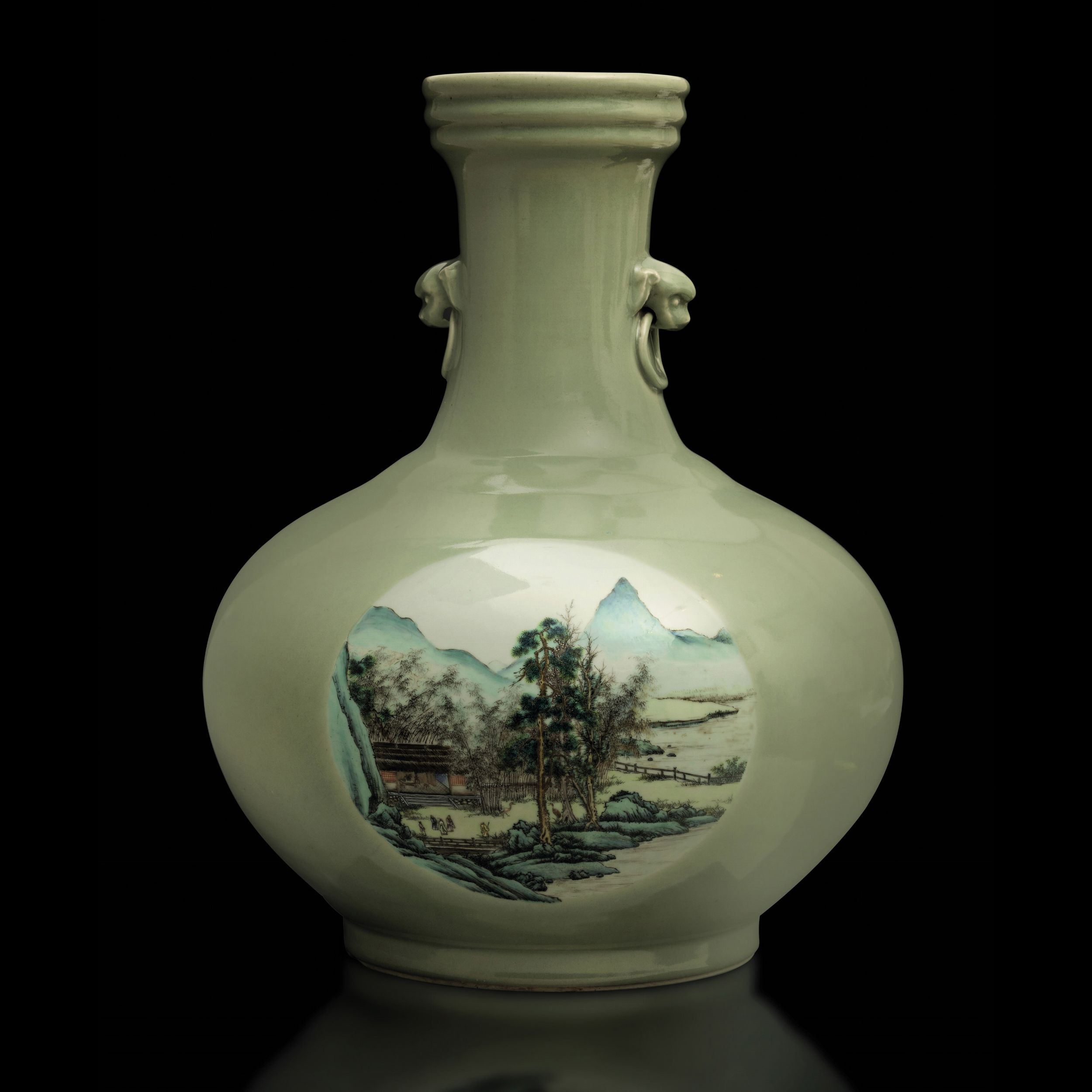 Vaso a bottiglia in porcellana Celadon a decoro paesaggistico entro riserva, Cina, [..]