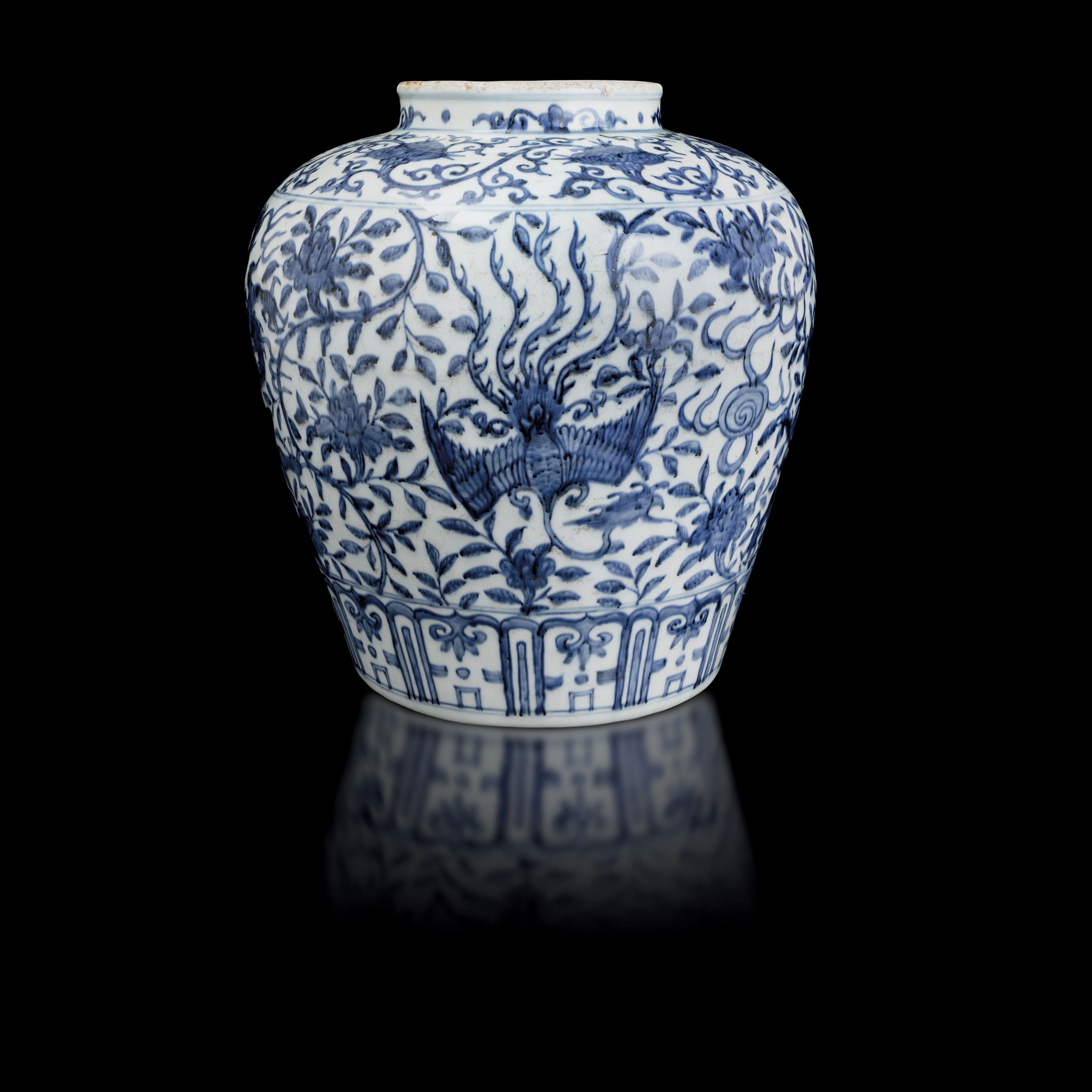 Vaso in porcellana bianca e blu a decoro floreale con fenice e drago, Cina, Dinastia [..]