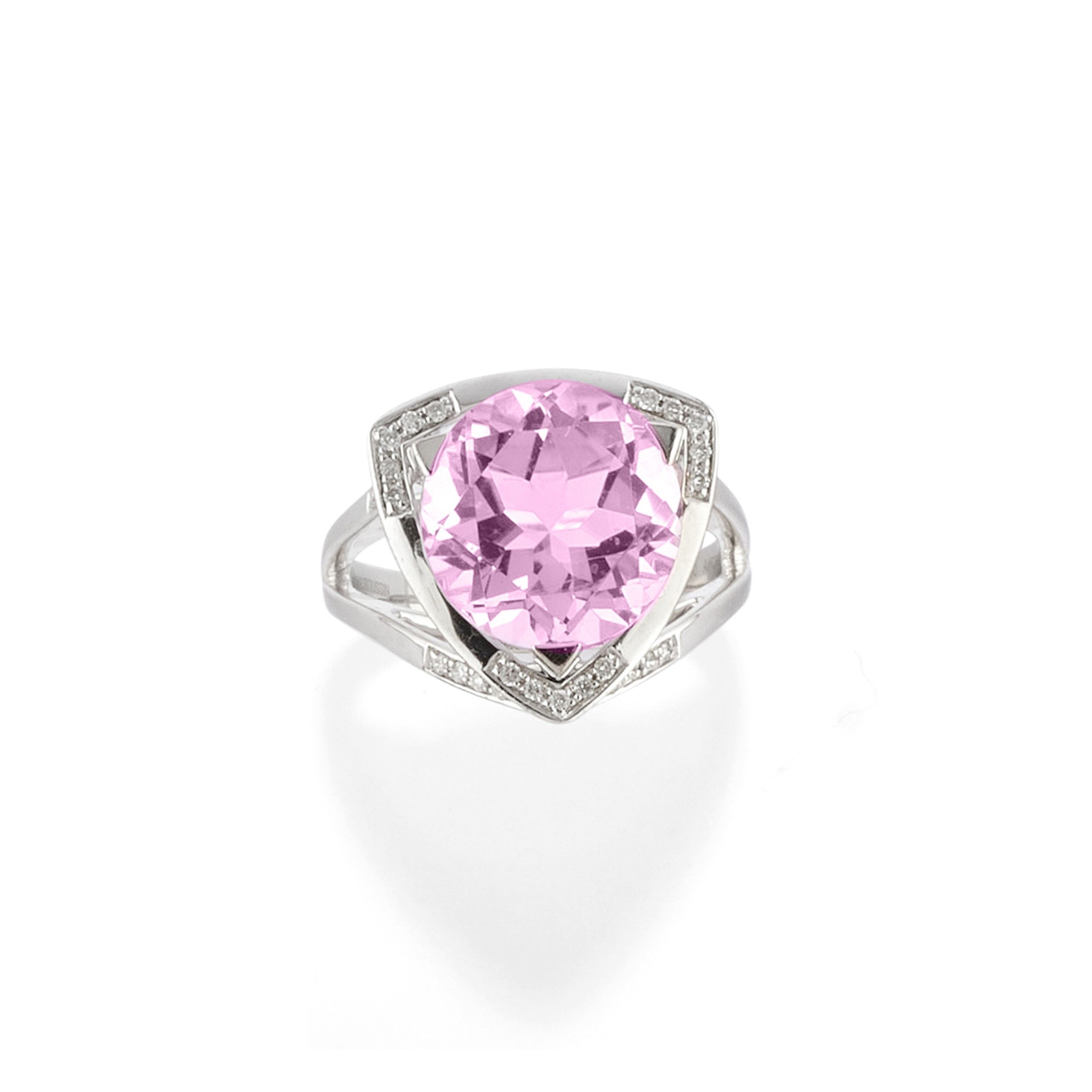 di forma stilizzata, al centro ametista taglio rotondo, diamanti taglio brillante a decoro.