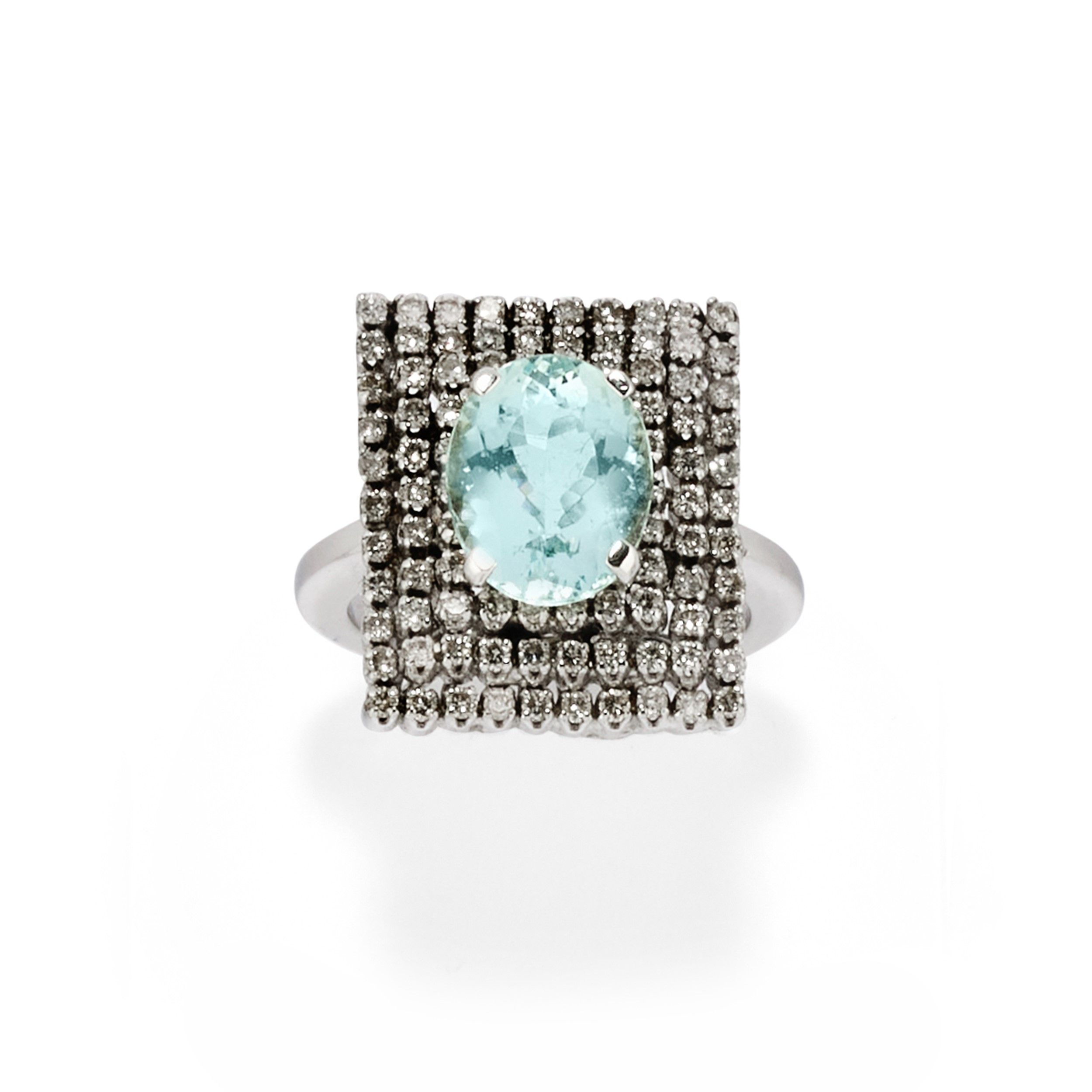 al centro acquamarina taglio ovale di ct 3,00 circa , entro cornice gradinata in diamanti taglio brillante di ct 1,00 circa.