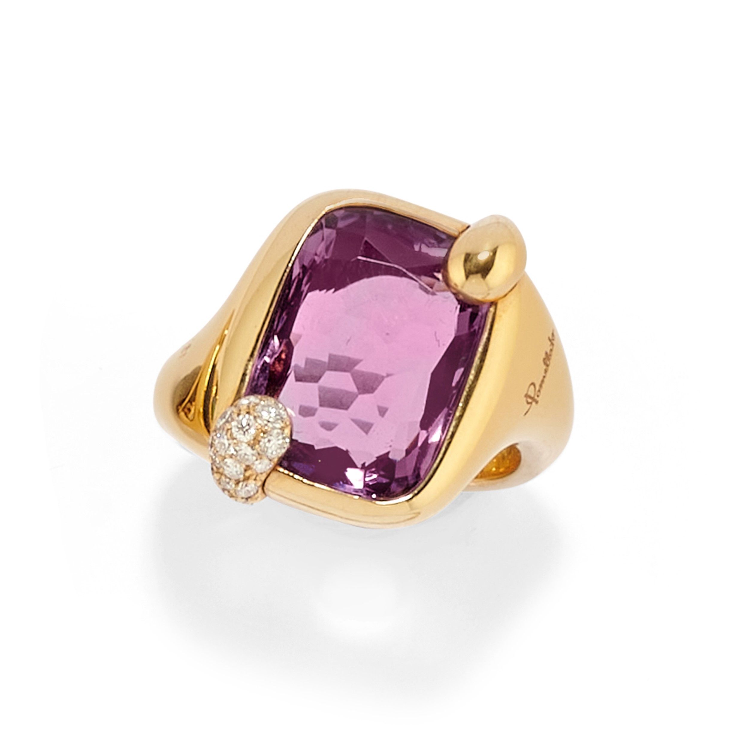 collezione Ritratto, con al centro ametista taglio cuscino, decoro in diamanti taglio brillante.