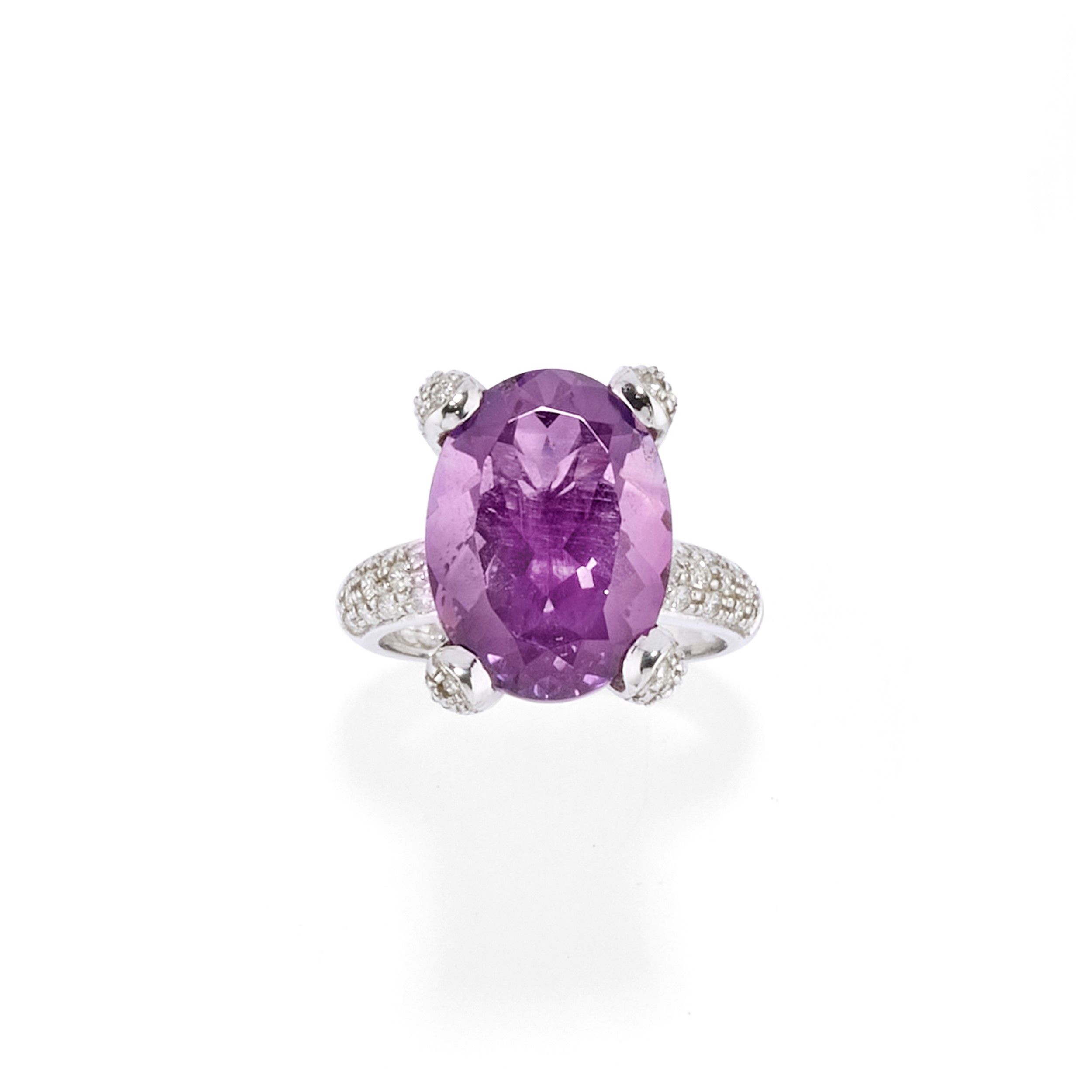 al centro ametista taglio ovale e decoro in diamanti taglio brillante per totale ct 1,30 circa.