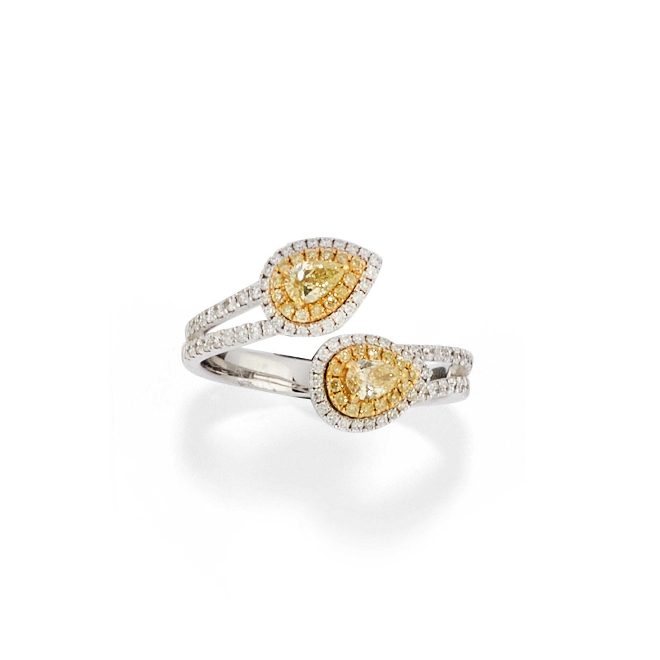 disposizione a contrarič, con diamanti incolore e fancy yellow taglio brillante e goccia per totale ct 1,00 circa.