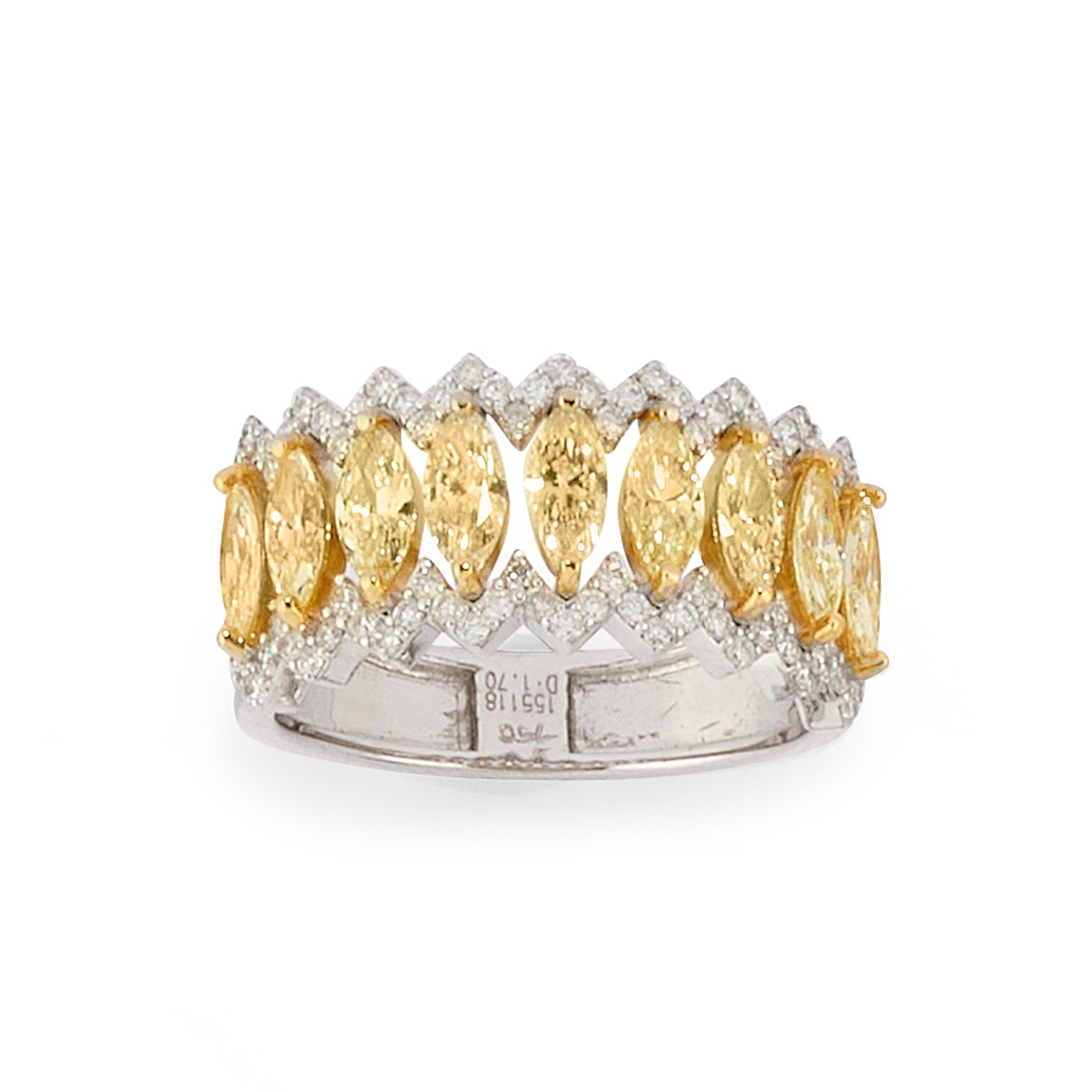 a fascia, realizzato con diamanti incolore e fancy yallow taglio navette e brillante per totale ct 1,70 (caratura incisa).