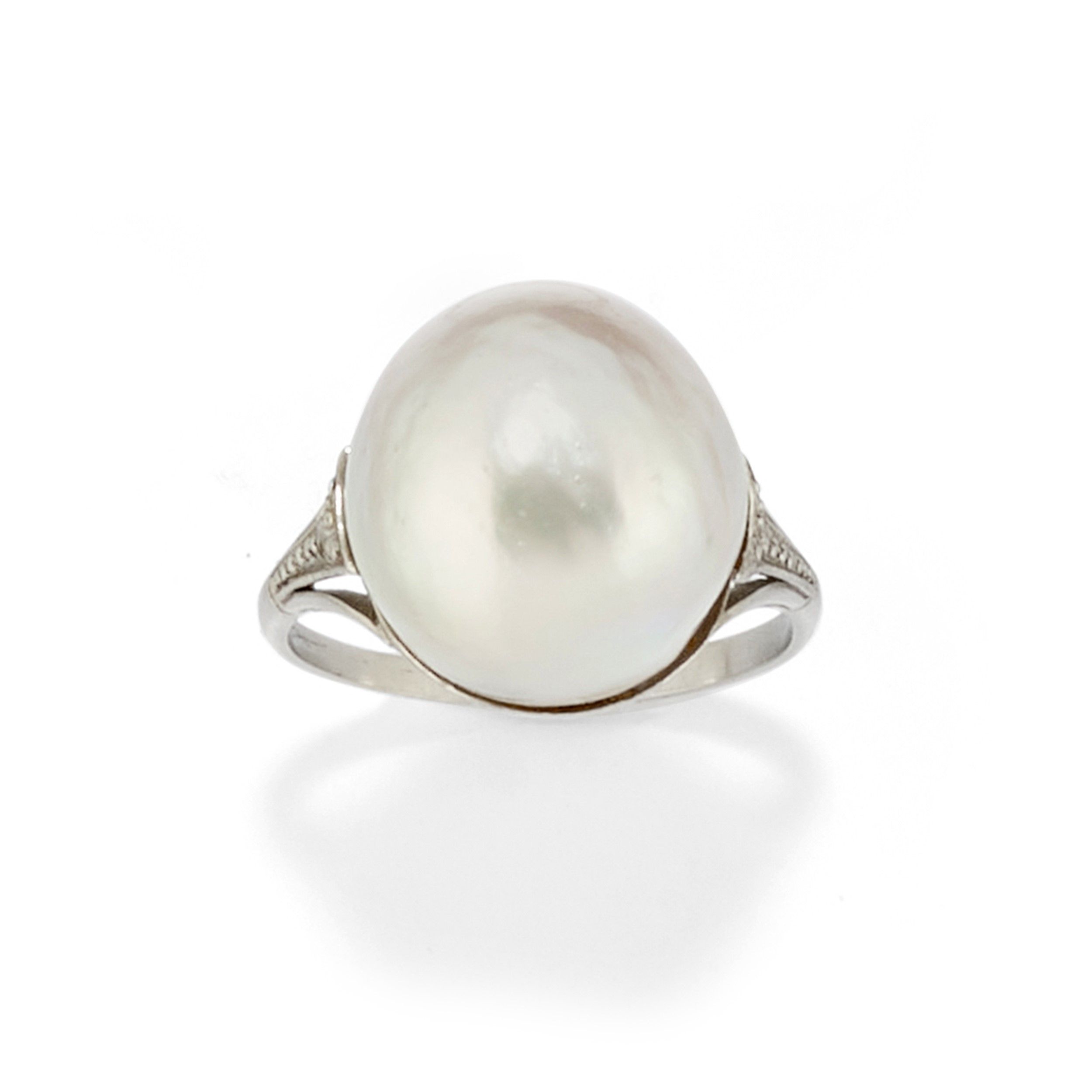 al centro una perla coltivata mabé di mm 13,00 circa e ai lati due diamanti taglio vecchio e huit-huit.