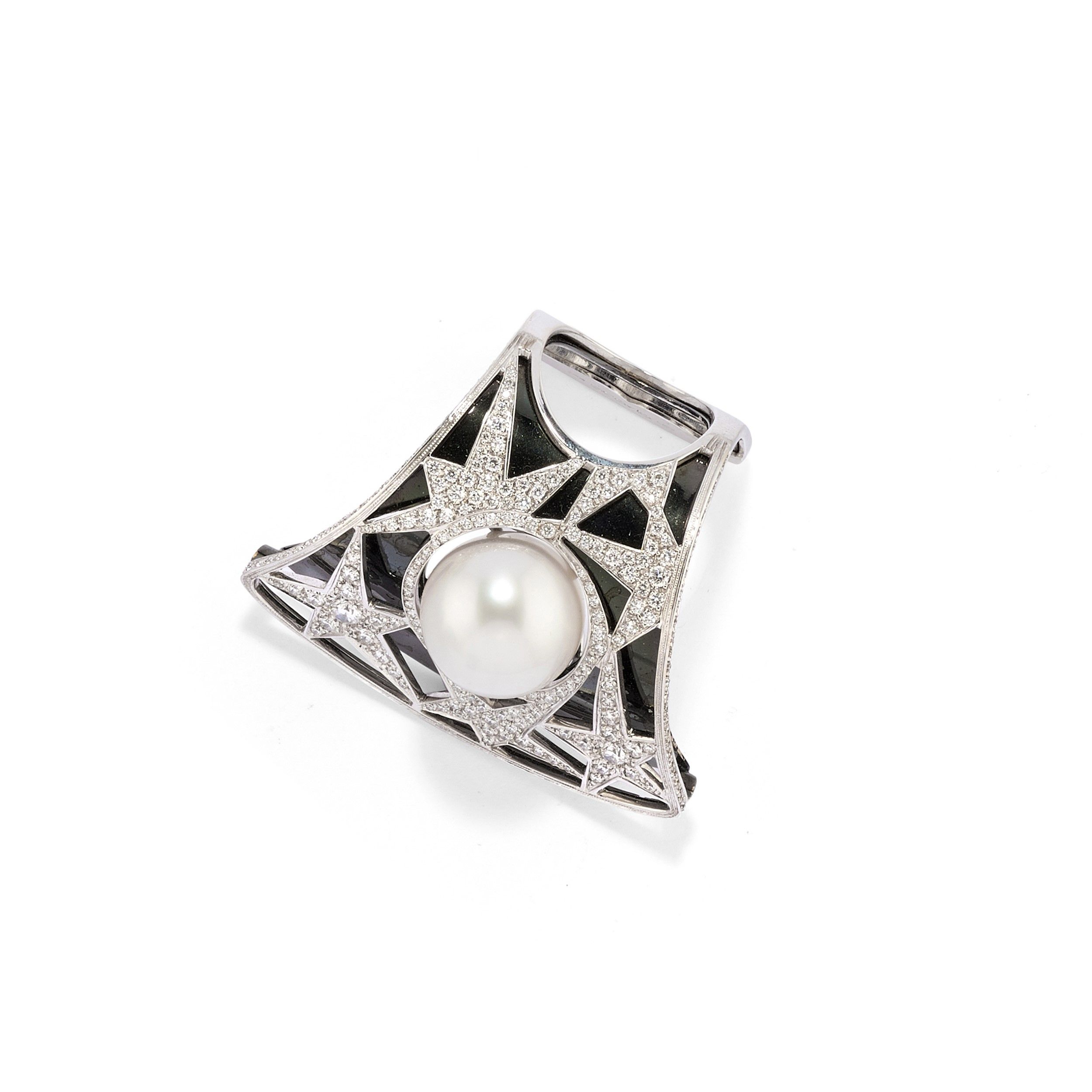 con motivi a stelle in diamanti taglio brillante su fondo brunito, al centro perla australiana coltivata di mm 14,50/15,00, con scatola.