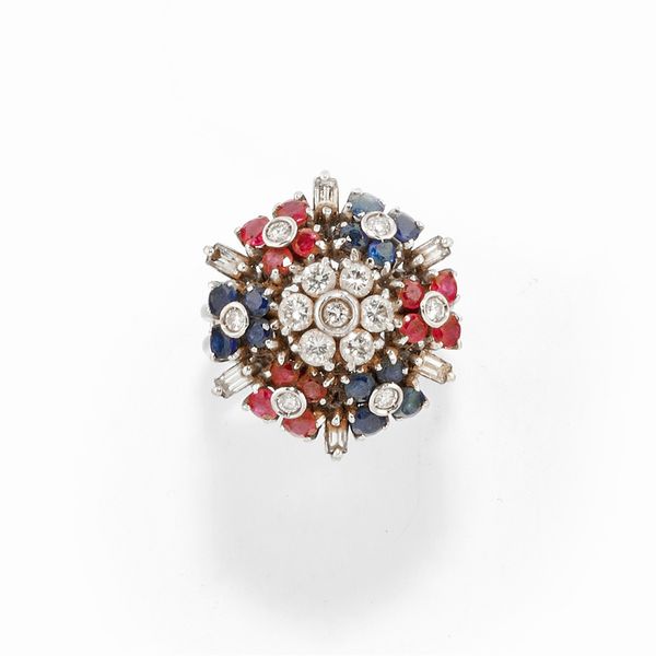 a fiore, impreziosito da rubini e zaffiri taglio rotondo, diamanti taglio brillante e baguette.