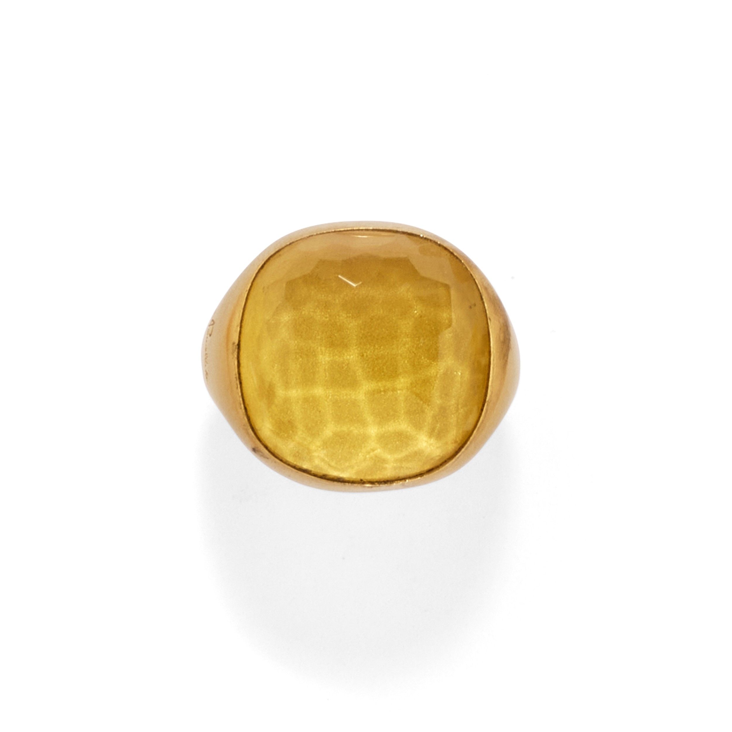 montatura sabbiata, con al centro inserto in quarzo citrino forma cuscino taglio briolette.