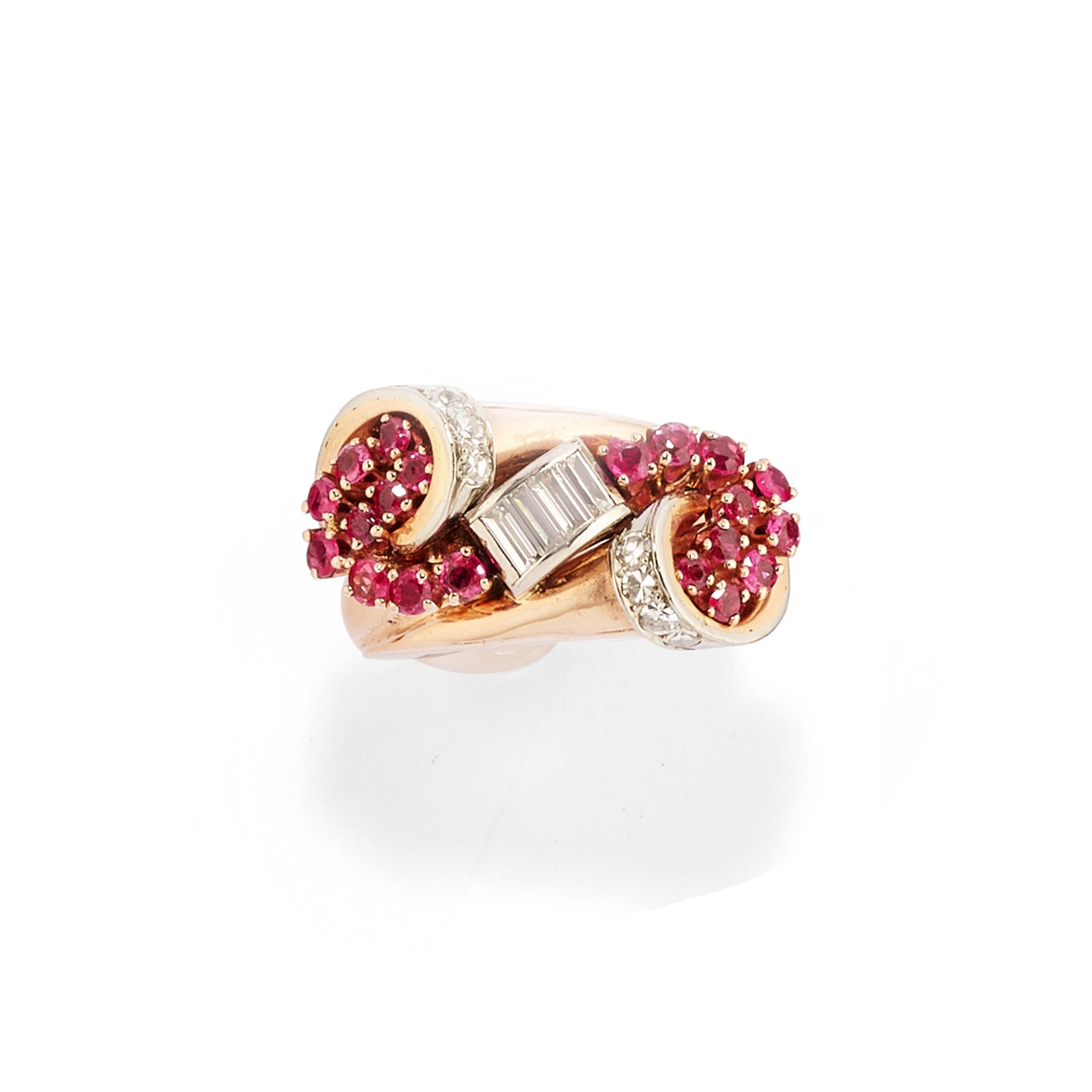 sommità a volute impreziosite da rubini taglio rotondo e motivi in diamanti taglio baguette e huit-huit.