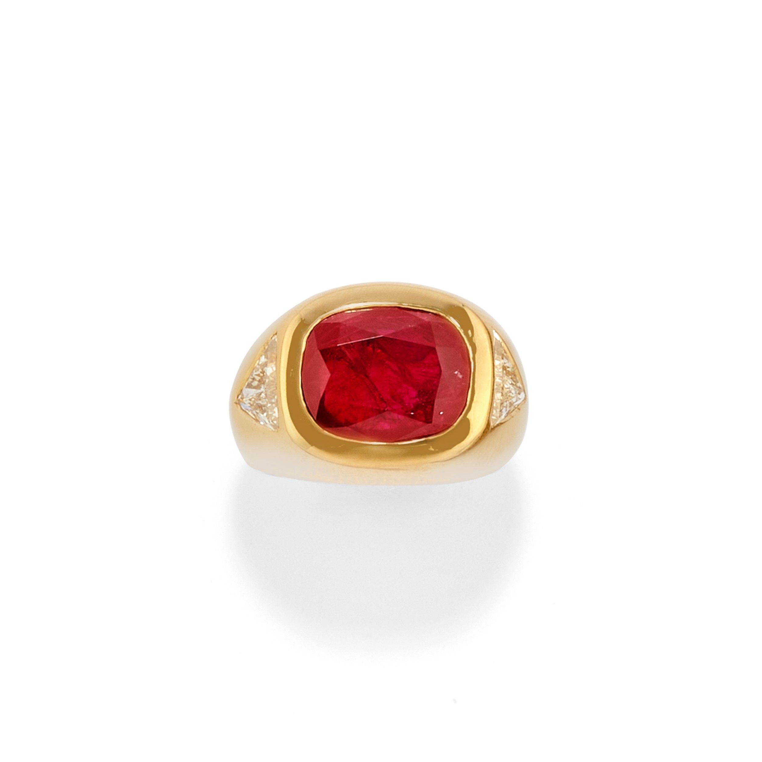 in oro giallo 18k, Peso g 18,65 misura 13 al centro un rubino taglio cuscino di ct 7,50 circa (non sono visibili indicazioni di trattamento termico) entro castone ribattuto e ai lati due diamanti taglio triangolo per totale ct 1,00 circa, difetti (visibili piccole mancanze di materiale).