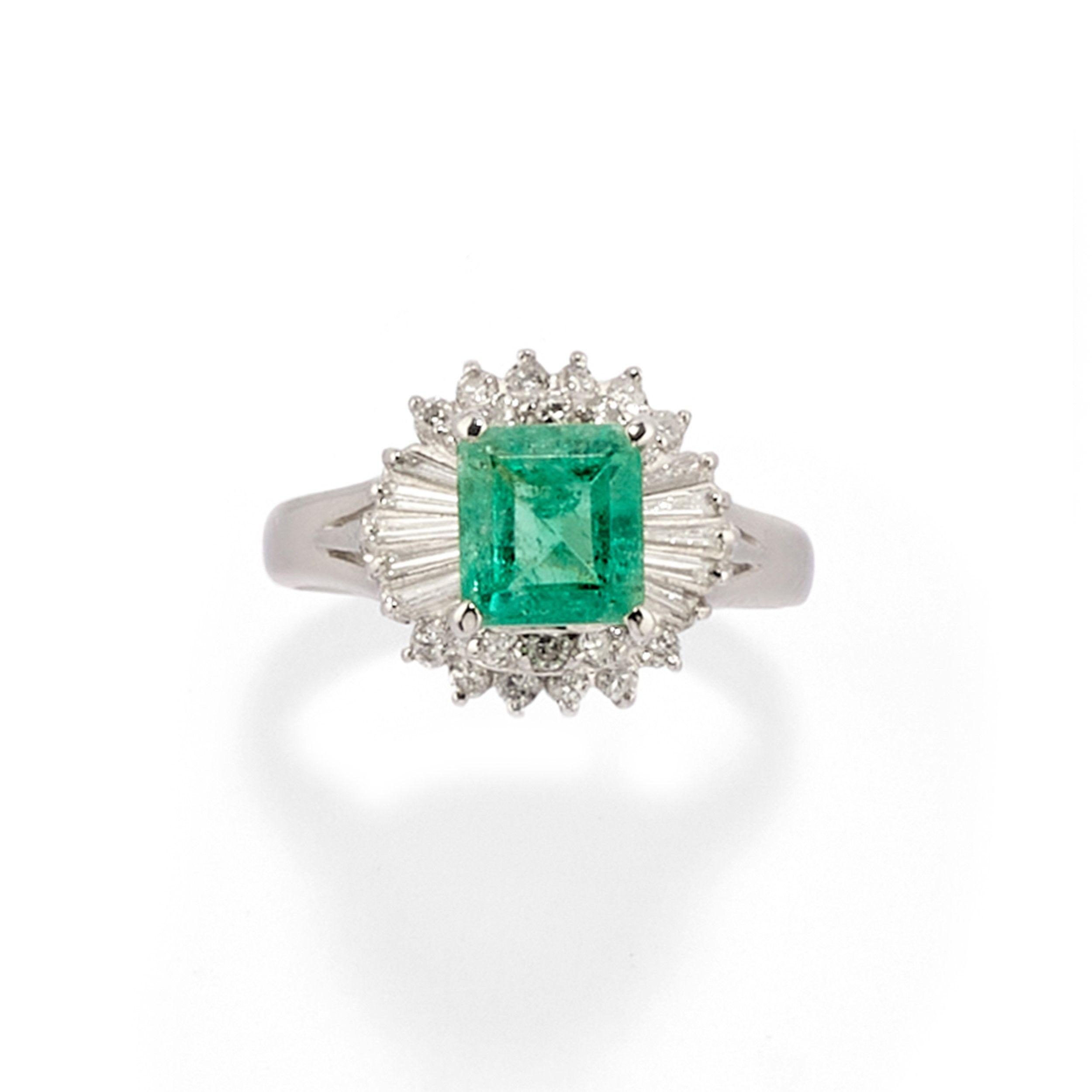 al centro smeraldo taglio rettangolare a contorno ottagonale di ct 1,13 (caratura incisa), diamanti taglio tapered baguette e brillante per totale ct 0,43 (caratura incisa).