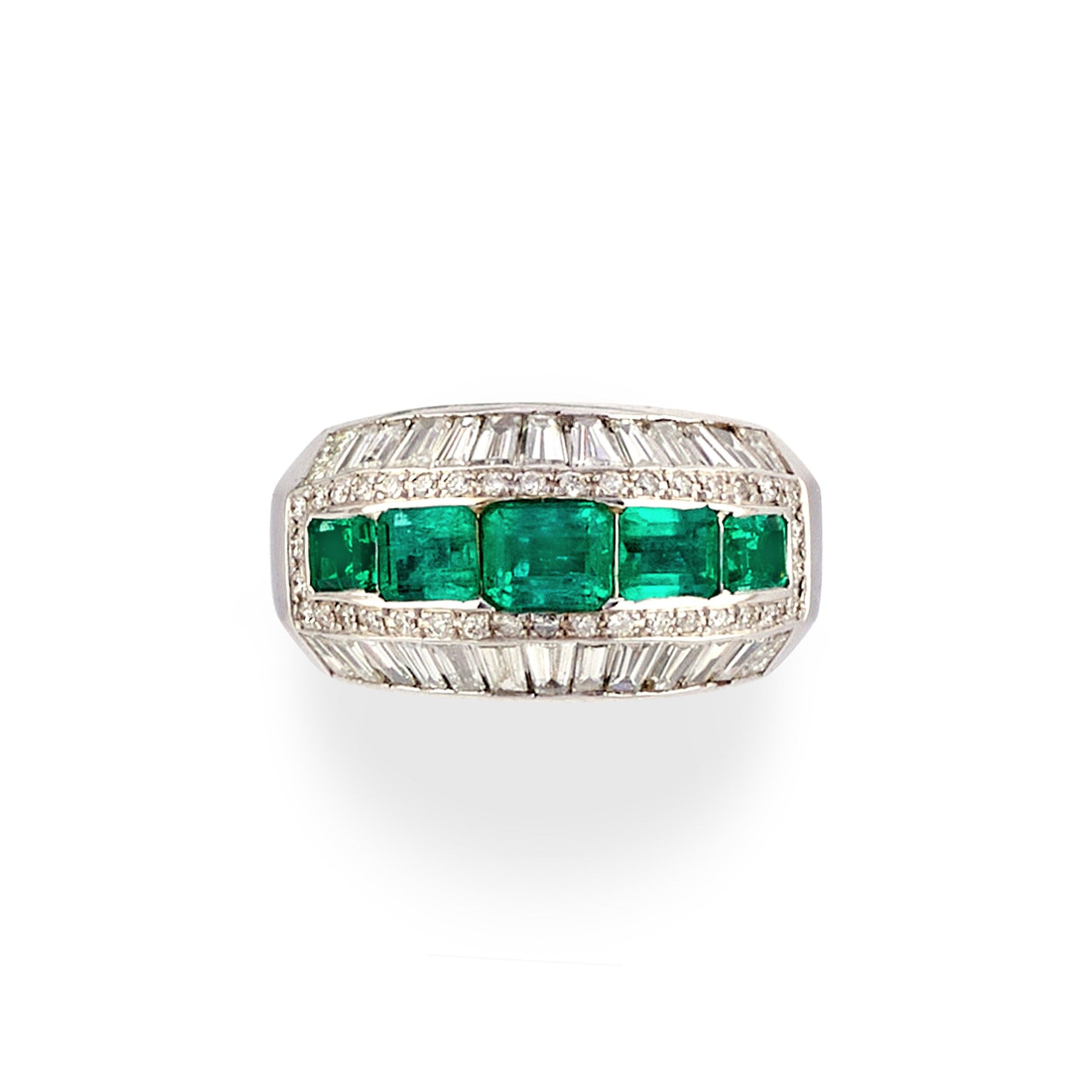 montatura bombata, al centro smeraldi taglio rettangolare a contorno ottagonale per totale ct 3,00 circa e diamanti taglio brillante e tapered baguette per totale ct 2,50 circa.