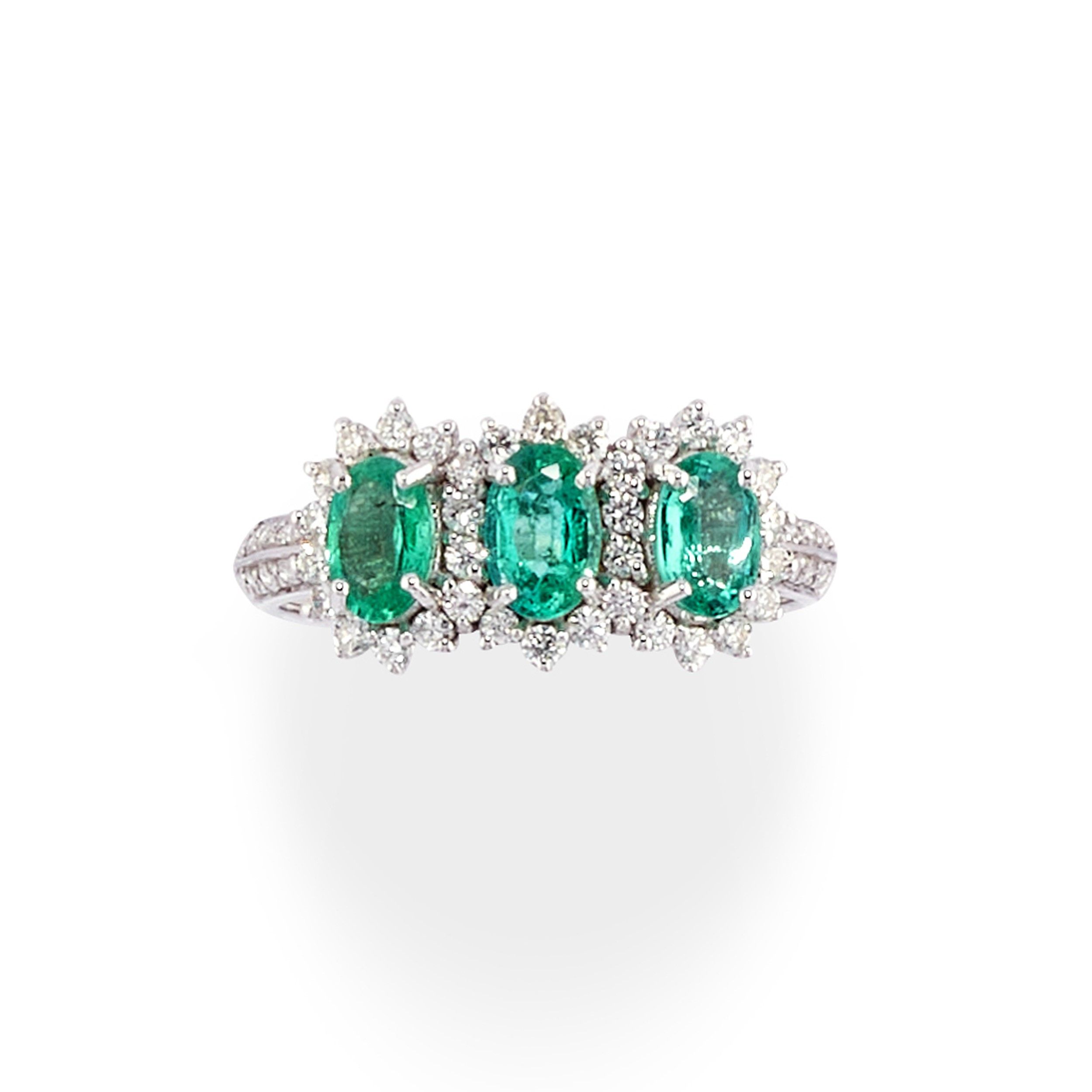 al centro smeraldi taglio ovale per totale ct 1,50 circa e diamanti taglio brillante per totale ct 0,50 circa.