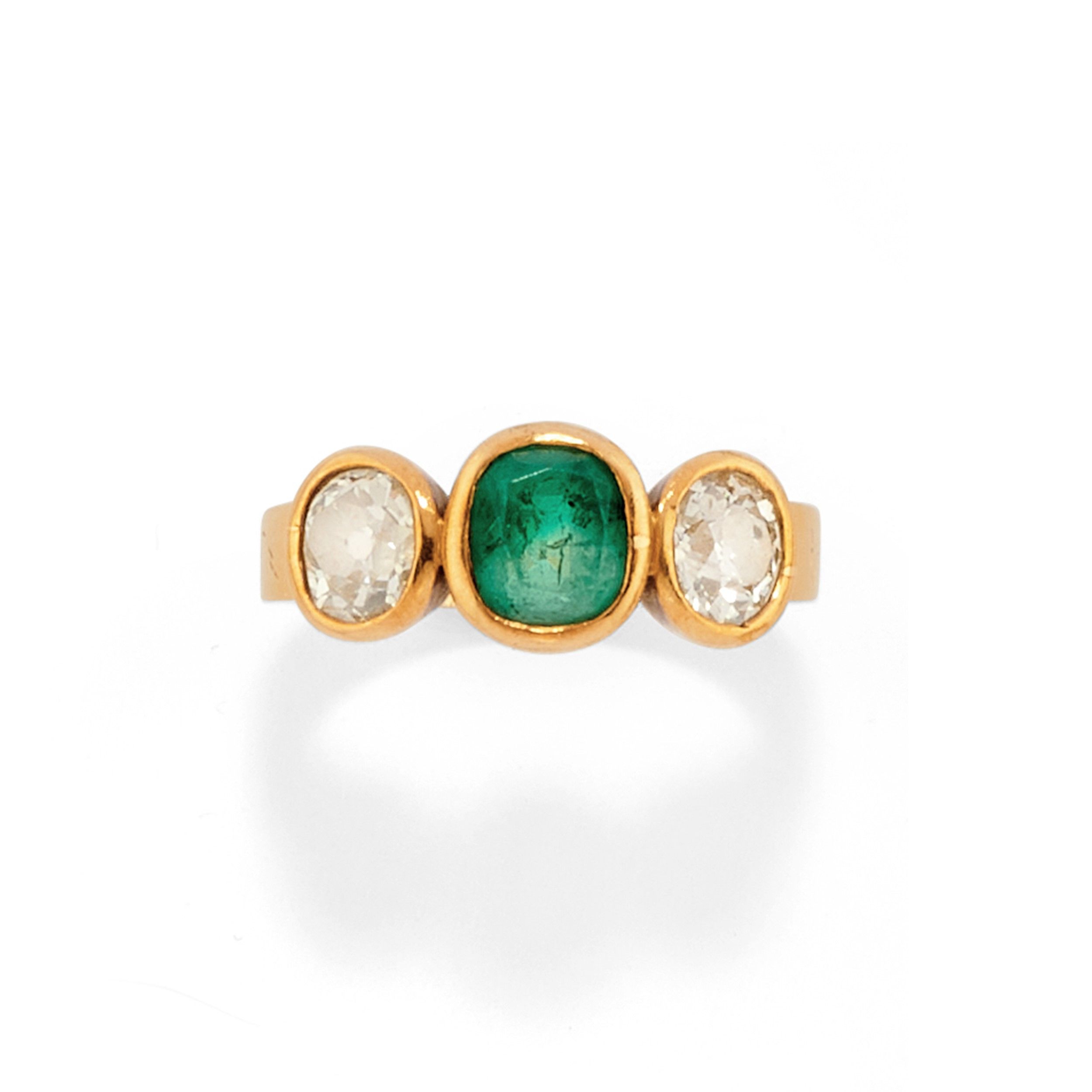 al centro smeraldo taglio cuscino, ai lati due diamanti taglio vecchio per totale ct 1,50 circa.