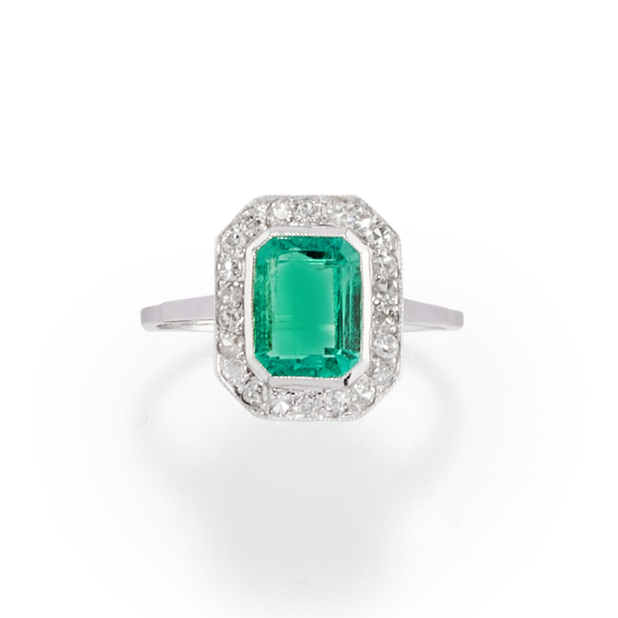 smeraldo Colombia taglio rettangolare a contorno ottagonale di ct 1,90 (caratura incisa) entro contorno in diamanti taglio huit-huit.