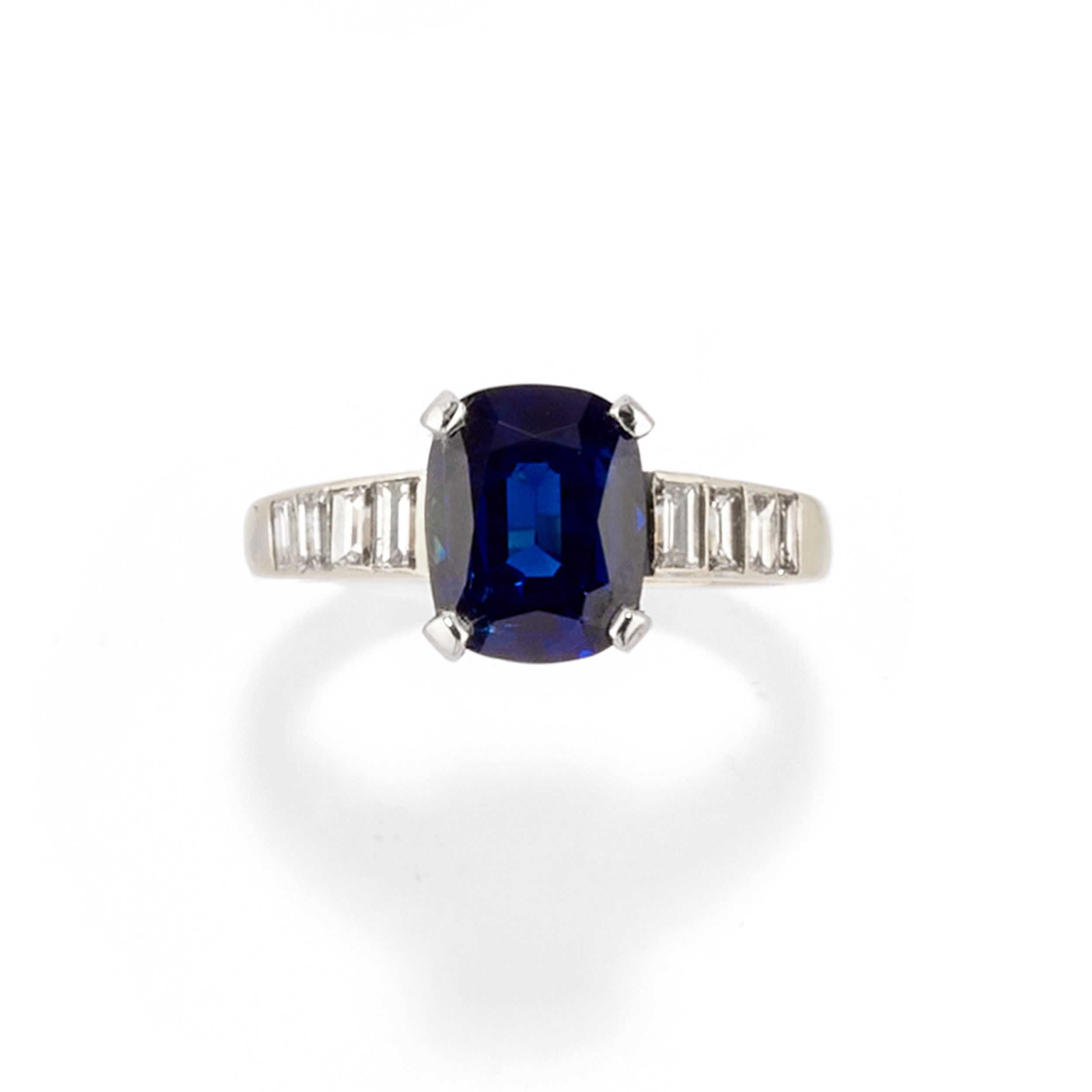 al centro zaffiro taglio cuscino di ct 2,78 (caratura incisa) ed ai lati diamanti taglio baguette.