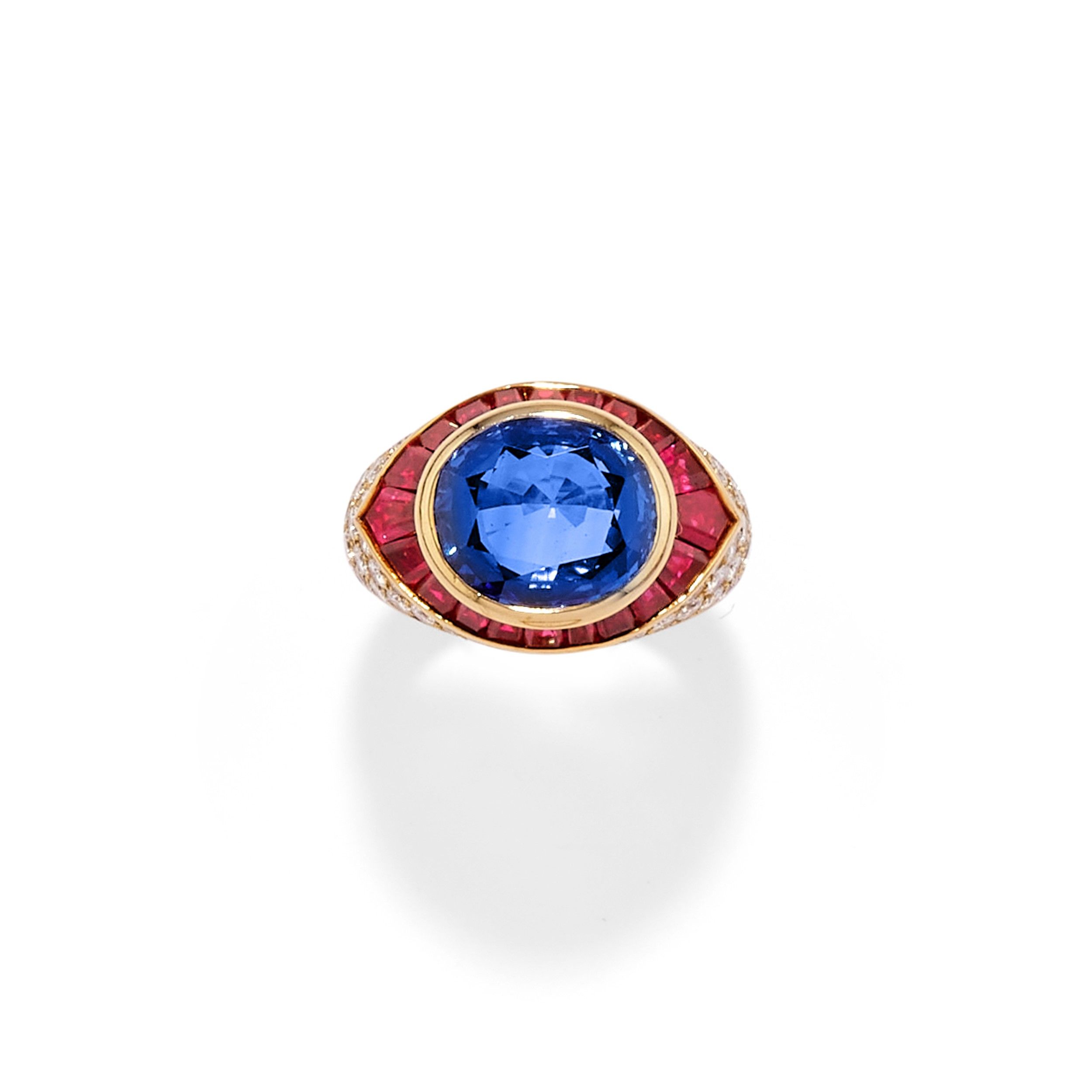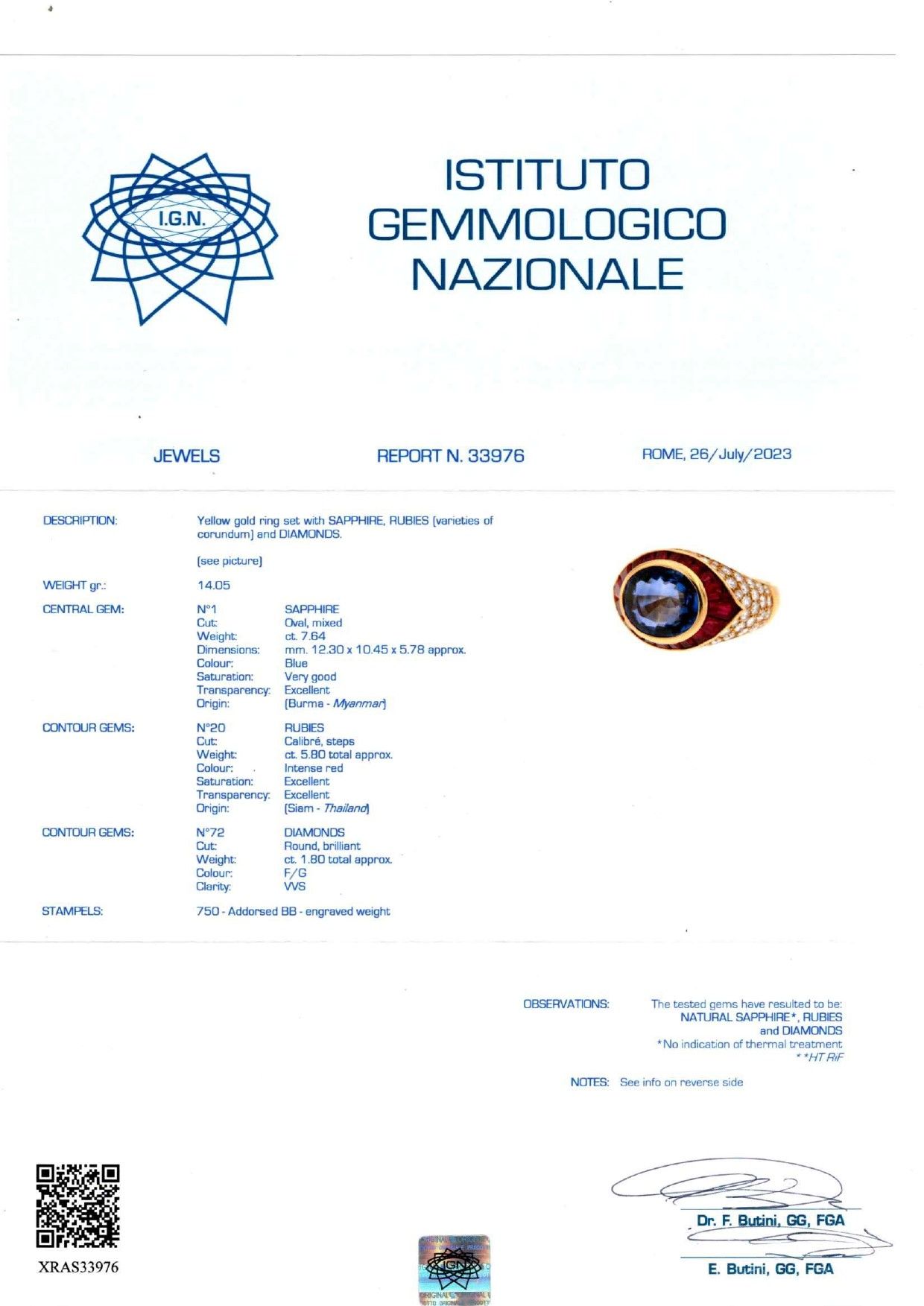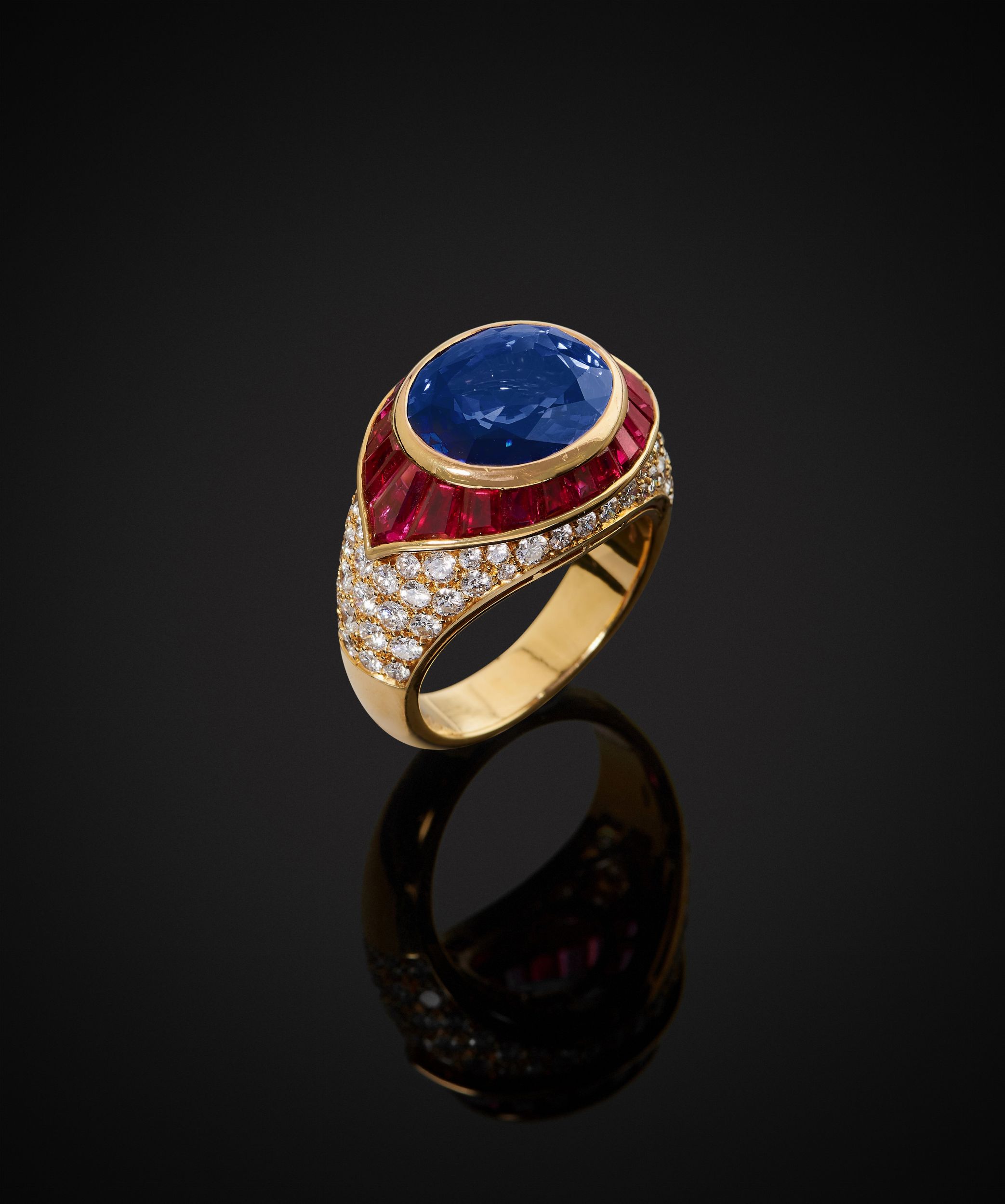 al centro zaffiro Burma taglio ovale di ct 7,64 (caratura incisa), contorno in rubini Siam taglio calibré per totale ct 5,80 circa, diamanti taglio brillante per totale ct 1,80 circa, prob. colore F/G, purezza VVS, con astuccio.