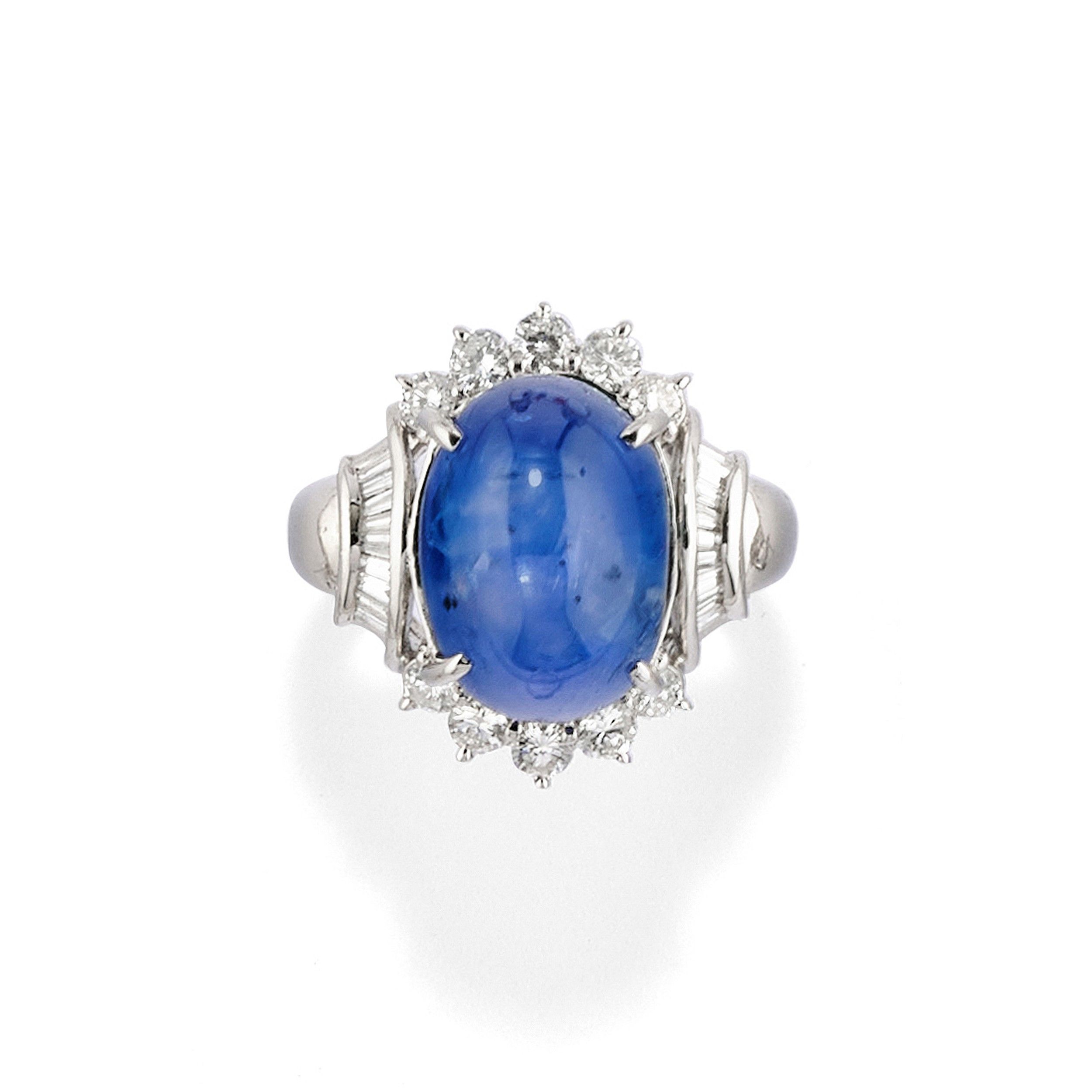al centro zaffiro stellato taglio ovale cabochon di ct 15,20 (caratura incisa) e contorno in diamanti taglio brillante e tapered baguette per totale ct 0,87 (caratura incisa).