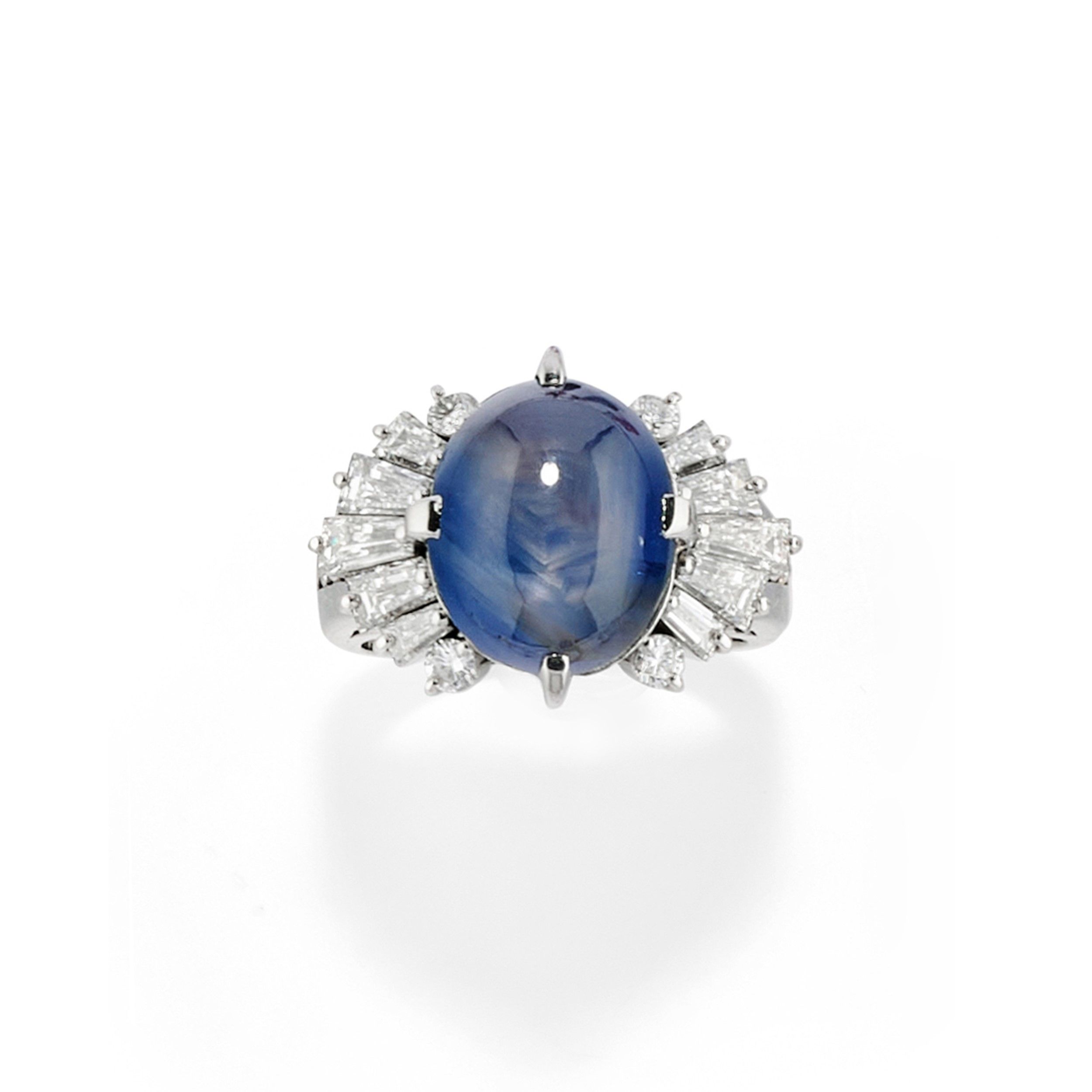 montatura decorata da diamanti taglio brillante e tapered baguette per totale ct 1,00 circa con al centro zaffiro stellato taglio ovale cabochon di ct 15,78 (caratura incisa).
