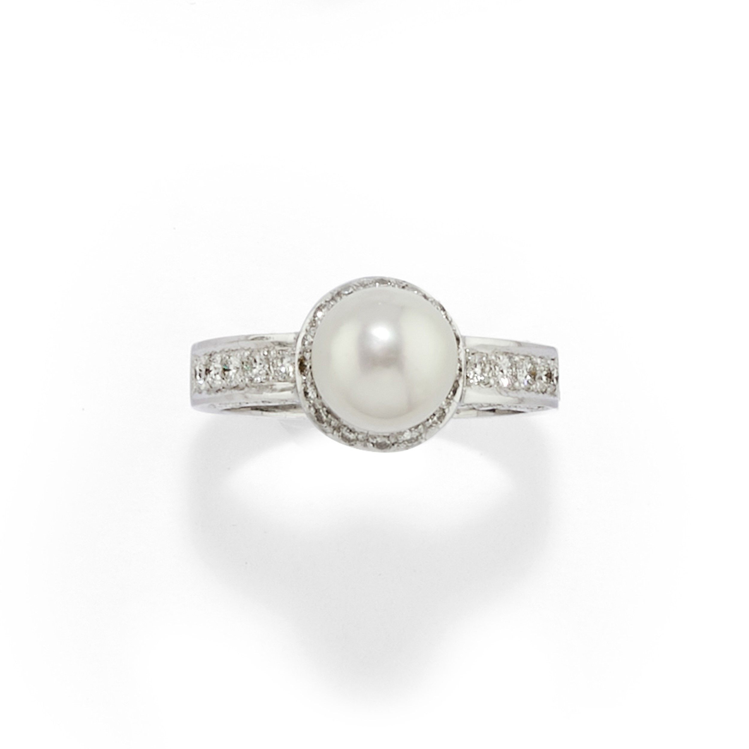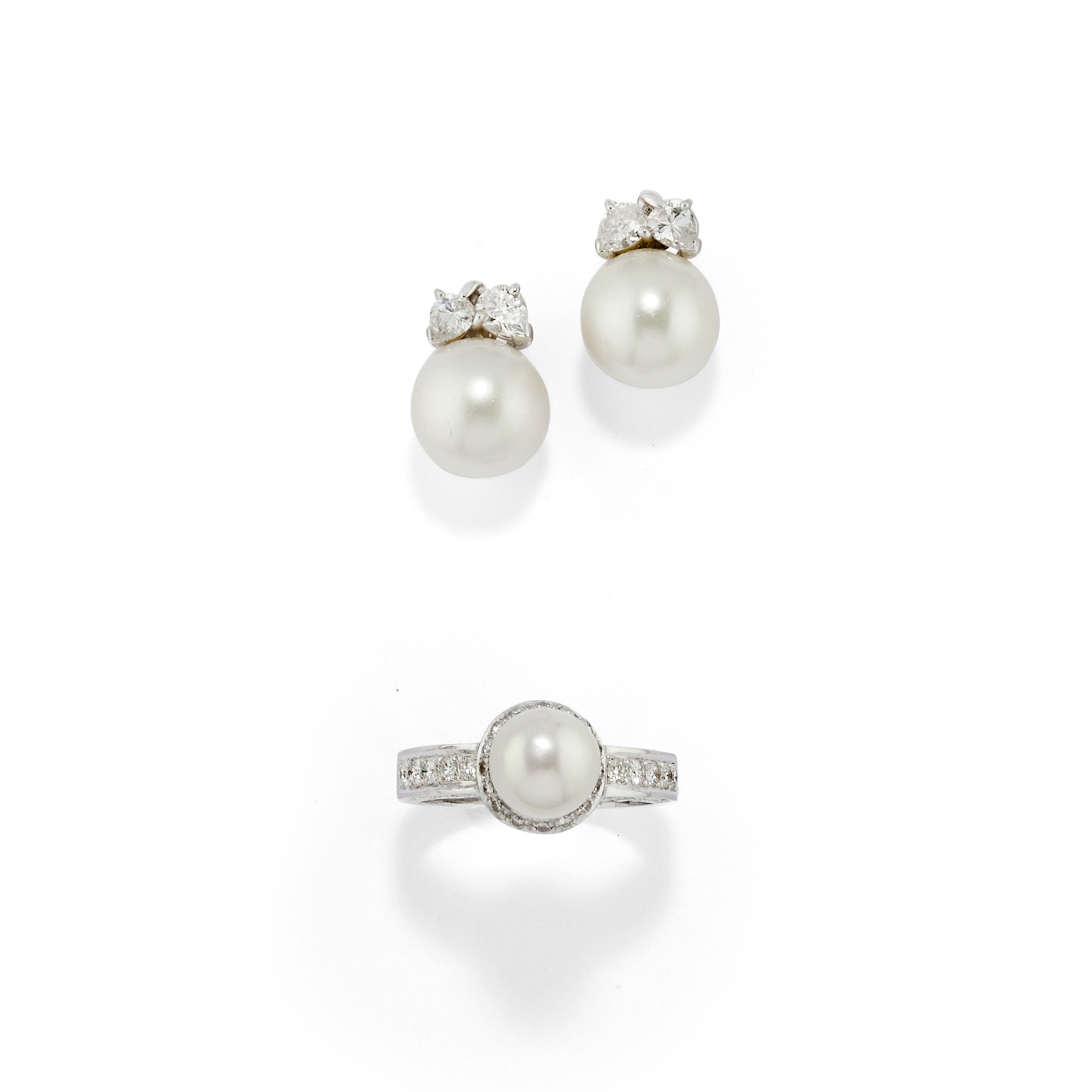 in oro bianco 18k, Peso g 14,80 misura 14 orecchini decorati con diamanti taglio goccia per totale ct 1,00 circa e perle coltivate mm 10,00 circa con chiusura con perno e farfalla, anello con perla coltivata di mm 8,00 circa e diamanti taglio brillante a decoro per totale ct 0,70 circa.