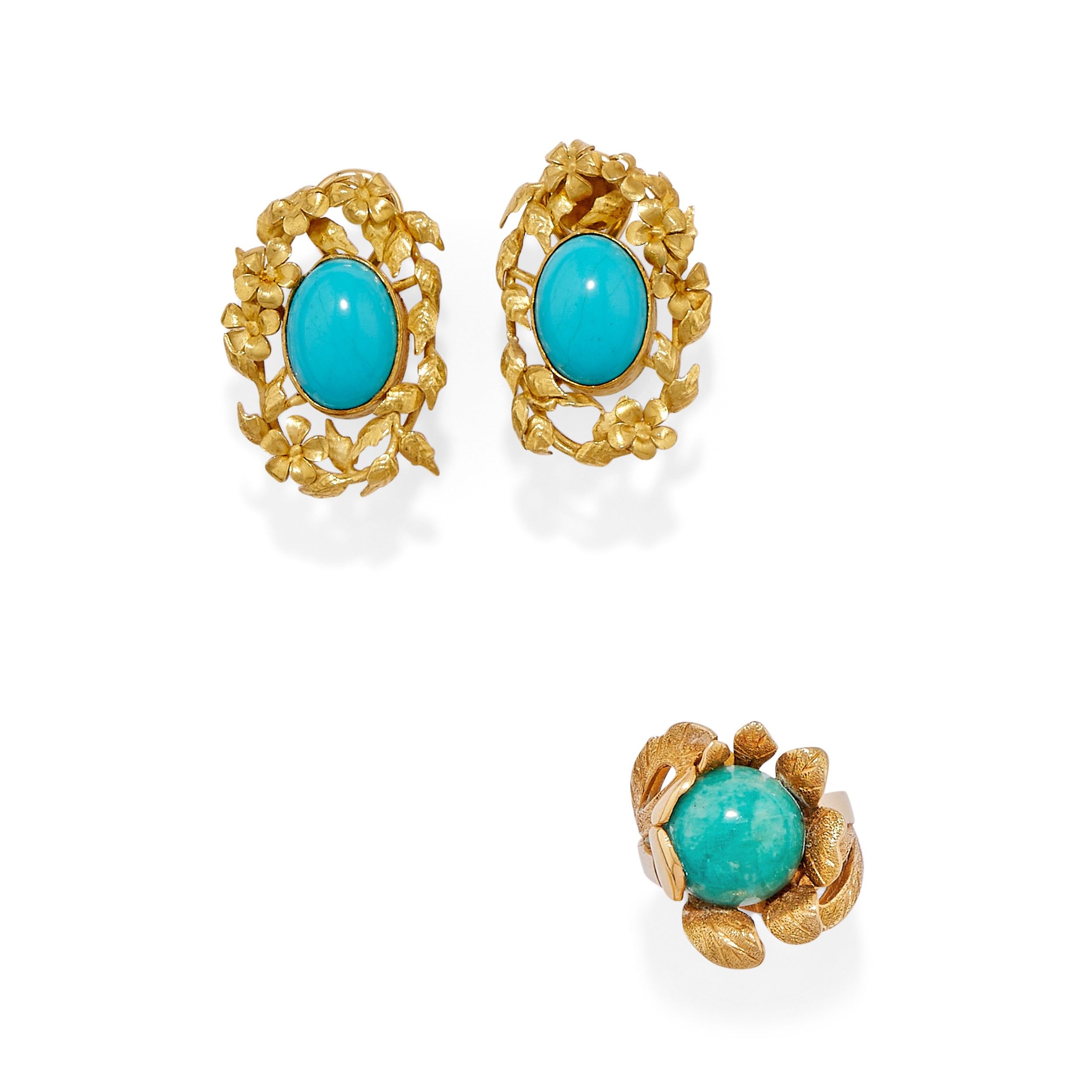 anello con pietra verde taglio rotondo cabochon e coppia di orecchini con turchese taglio ovale cabochon, chiusura a clip.