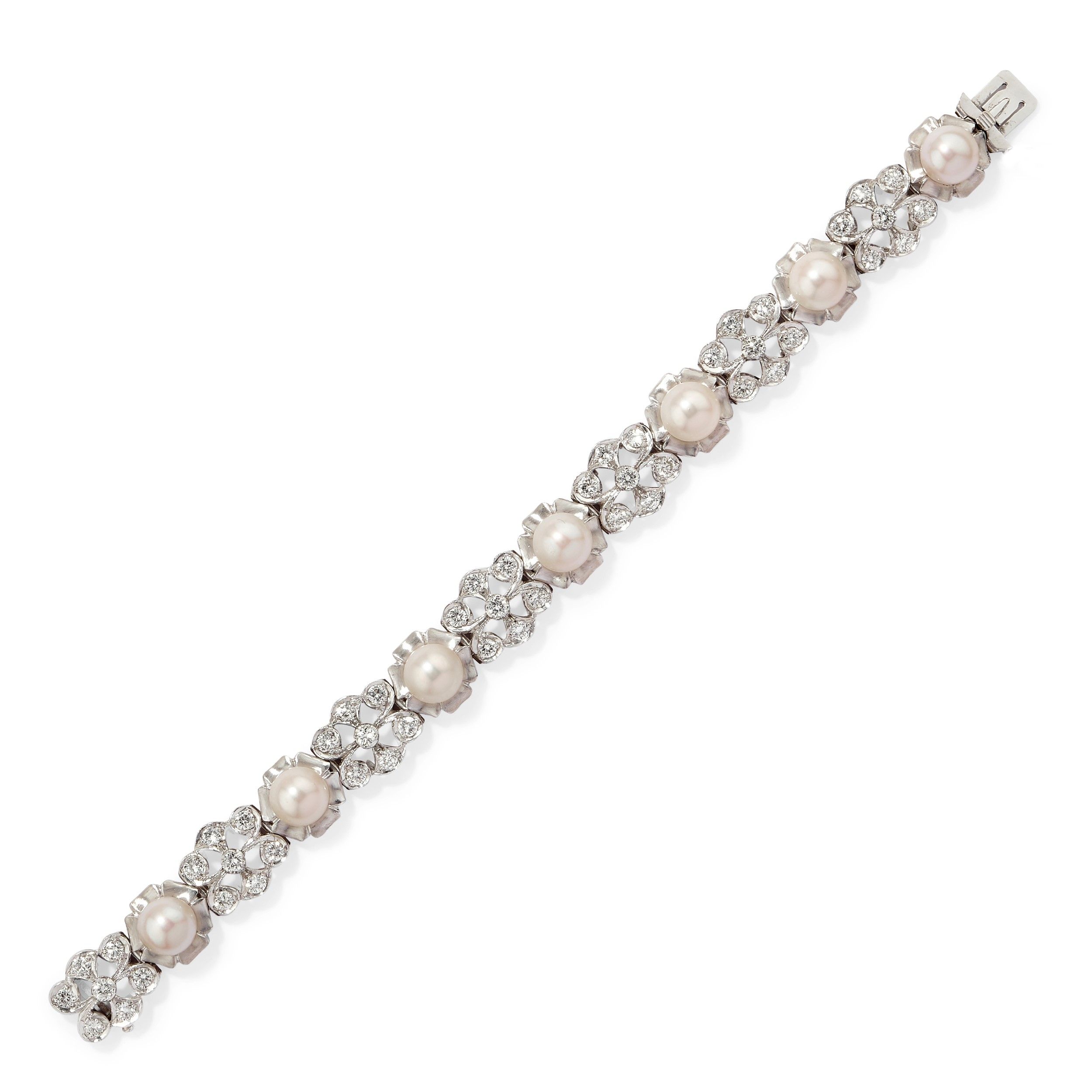 motivi a fiore con sette perle coltivate Giappone di mm 9,00 circa alternati a settori in diamanti taglio brillante per totale ct 3,00 circa.